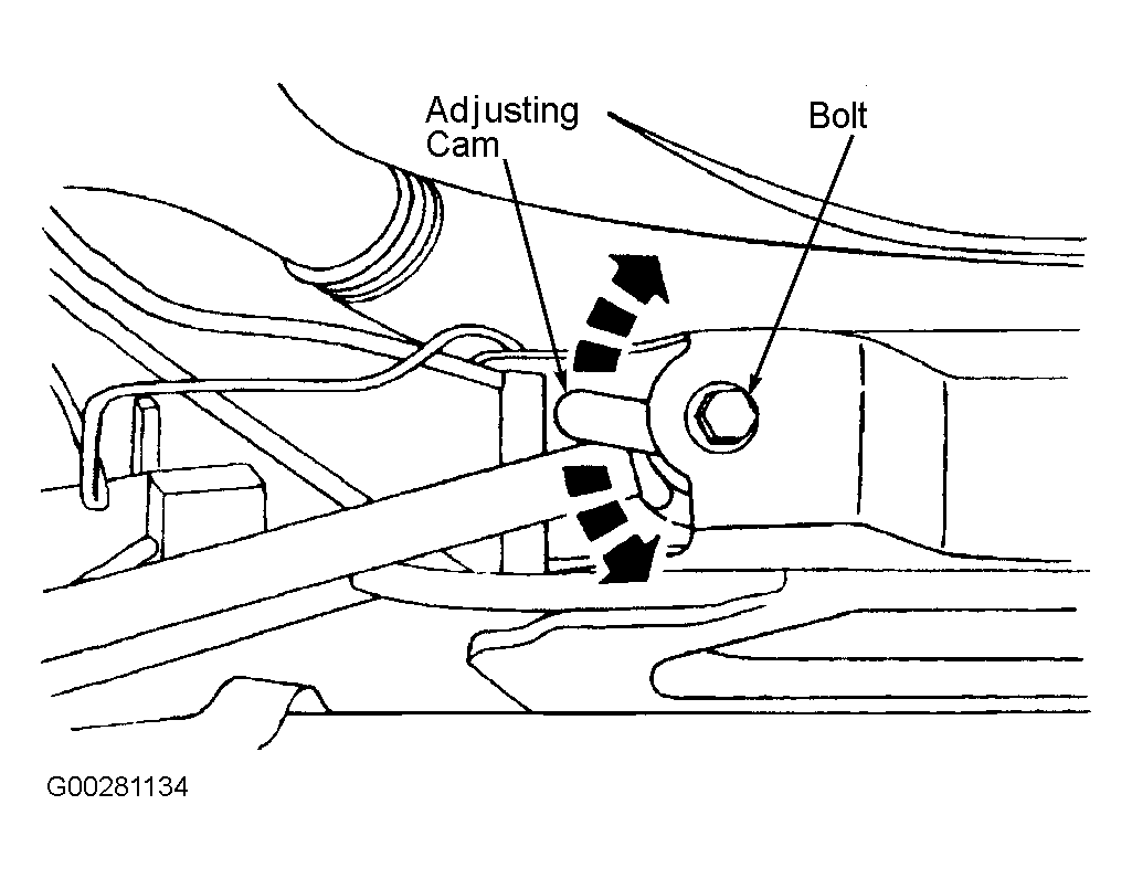 Loosen both lower control arm and bushing bolts. See Fig 1 . Turn left and right side adjusting cams simultaneously until toe in within specification. See WHEEL ALIGNMENT SPECIFICATIONS . Tighten bolts to specification. See TORQUE SPECIFICATIONS .