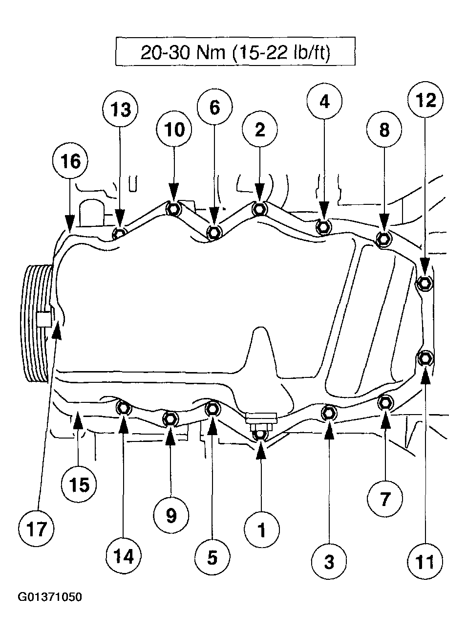 - Install the oil pan. Tighten the bolts from the middle out as shown in Fig 1.