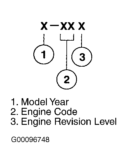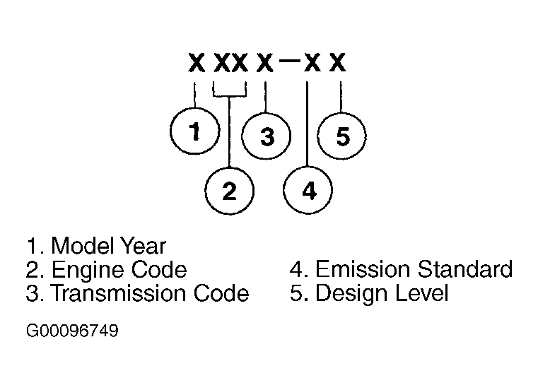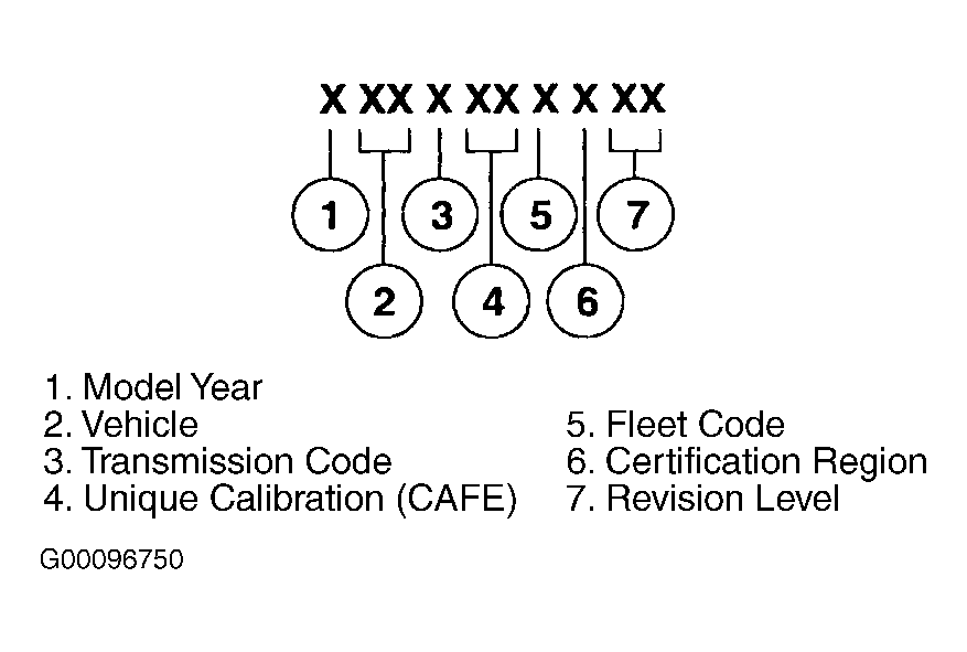 Powertrain calibration information is printed in the lower right corner of the Vehicle Emission Control Information (VECI) label. Only the base calibration information is printed. Revision levels will not appear. For the current model year, Ford Motor Company is using 3 different protocols which describe powertrain base calibration. These protocols are designed to provide worldwide standardization for vehicle calibration. If electronic calibration strategy has been used since 1998 and carried into current model year, Protocol 1 will be used. See Fig 1. If electronic calibration strategy has been used since 1999 and is carried into current model year, Protocol 2 will be used. See Fig 2. For electronic calibration strategies introduced since the 2000 model year, Protocol 3 will be used. See Fig 3. See PROTOCOL 3 CODE DESCRIPTIONS .