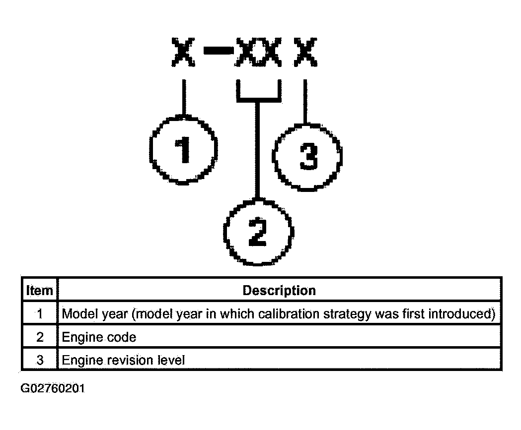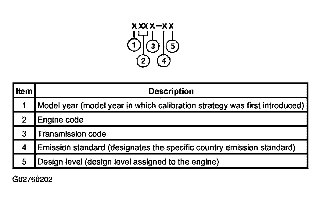 Powertrain calibration information is printed in the lower right corner of the vehicle certification label. Only the base calibration information is printed. Revision levels will not appear, however, they can be found in On Line Automotive Service Information System (OASIS). For the current model year, Ford Motor Company is using three different protocols which describe powertrain base calibration. These protocols are designed to provide worldwide standardization for vehicle calibration. If the electronic calibration strategy has been used since 1998 and carried into the current model year, Protocol 1 will be used. Refer to Fig 2 below. If the electronic calibration strategy has been used since 1999 and is carried into the current model year, Protocol 2 will be used. Refer to Fig 3 below. For electronic calibration strategies introduced in 2000 or later model years, use Protocol 3. Refer to Fig 4 below.