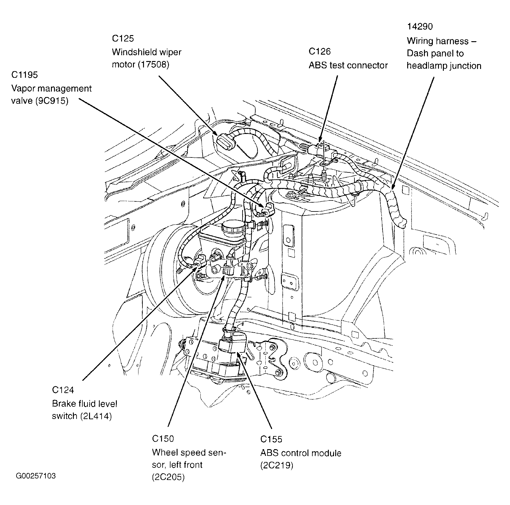 ABS Control Module On left rear side of engine compartment. See Figure .