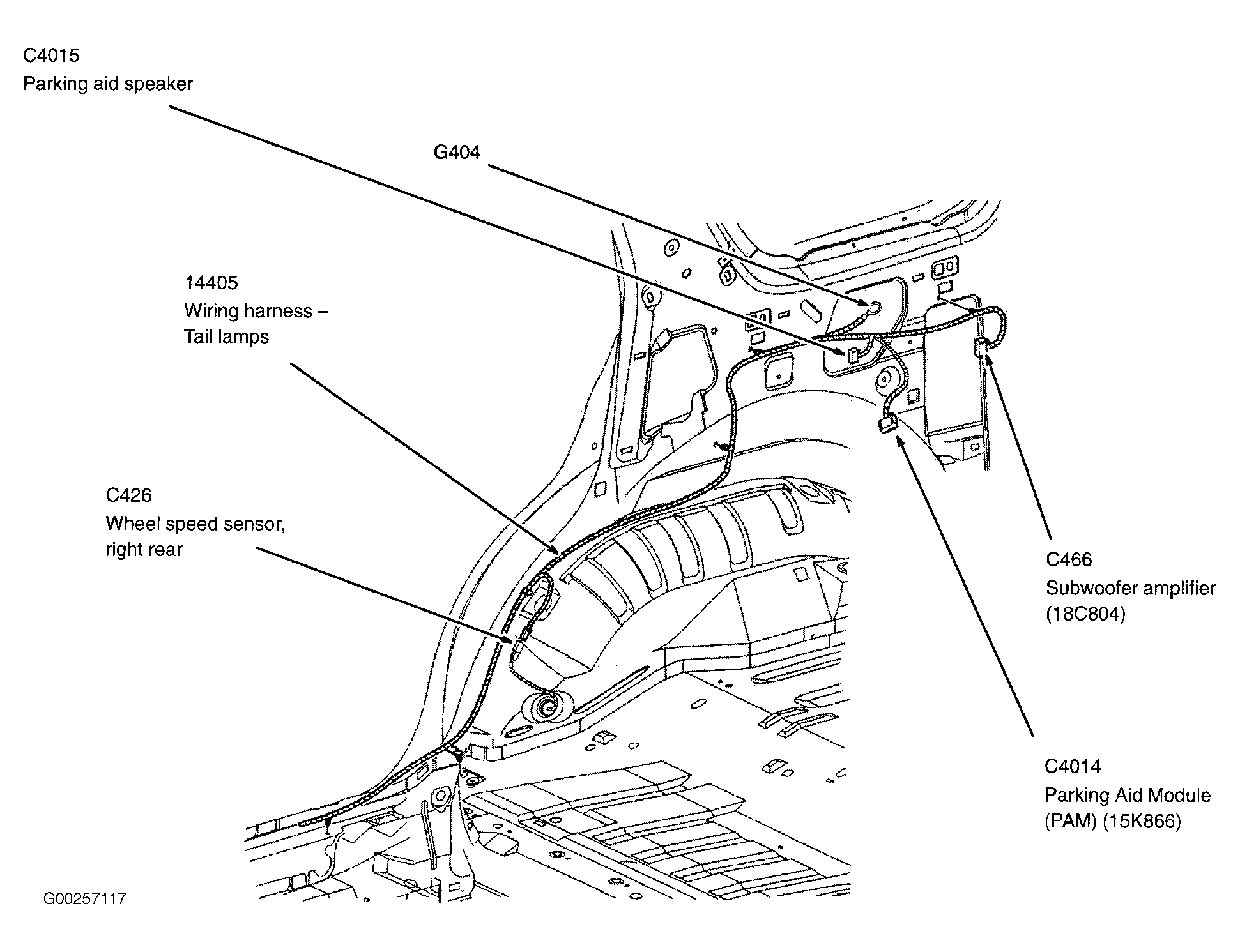Parking Aid Module (PAM) At right rear side of vehicle floor. See Figure .