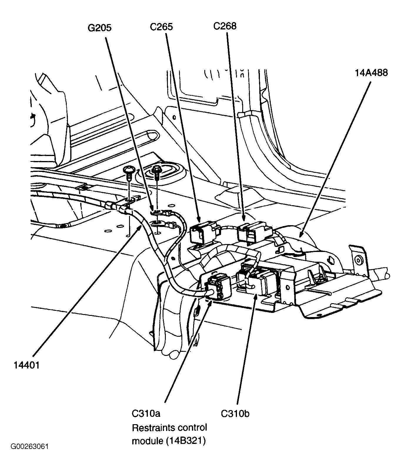 Restraints Control Module Below center console. See Figure.