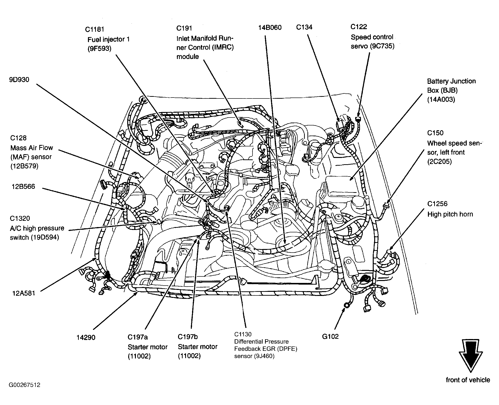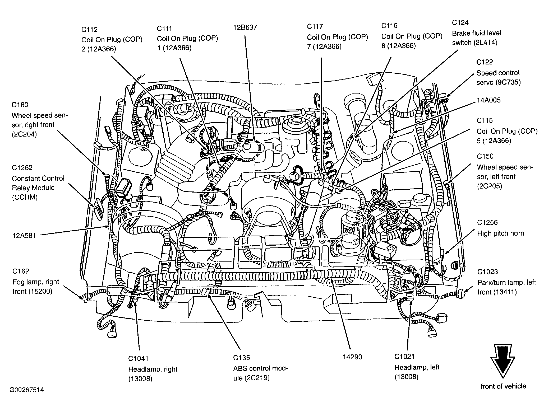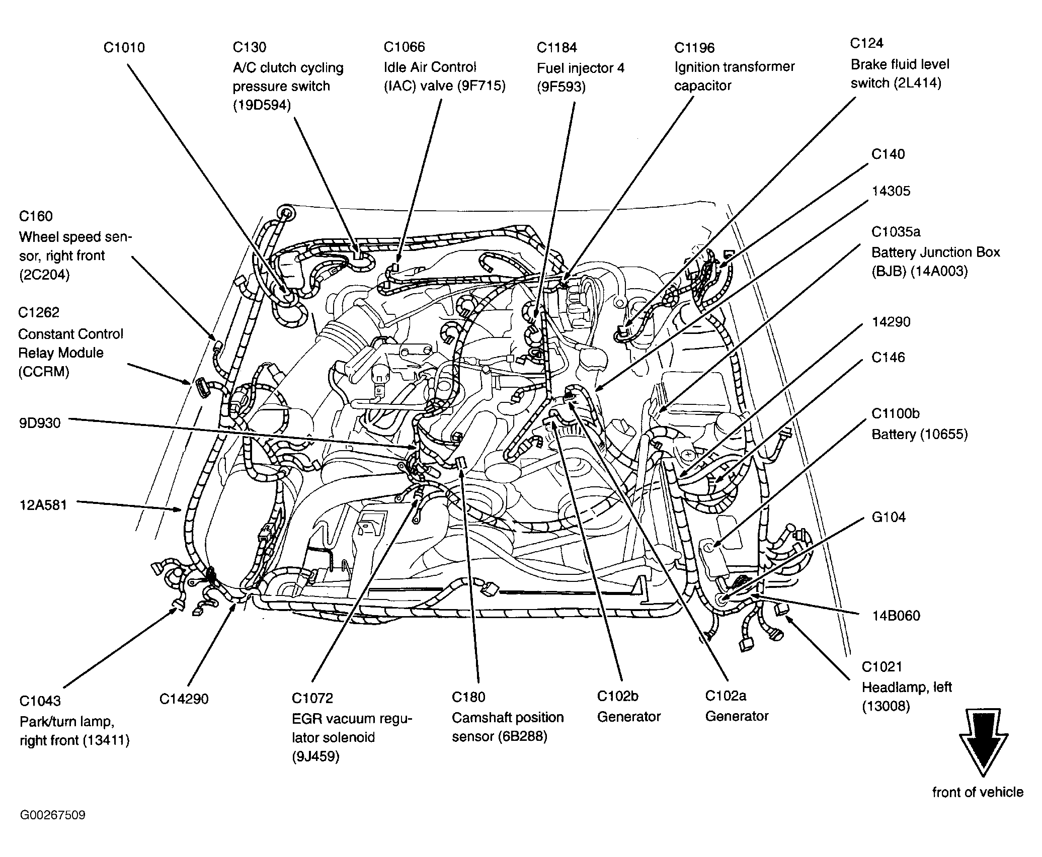 | Constant Control Relay Module (CCRM) (4.6L 2V) | Inside right front fender, behind air filter housing. See Figure. |