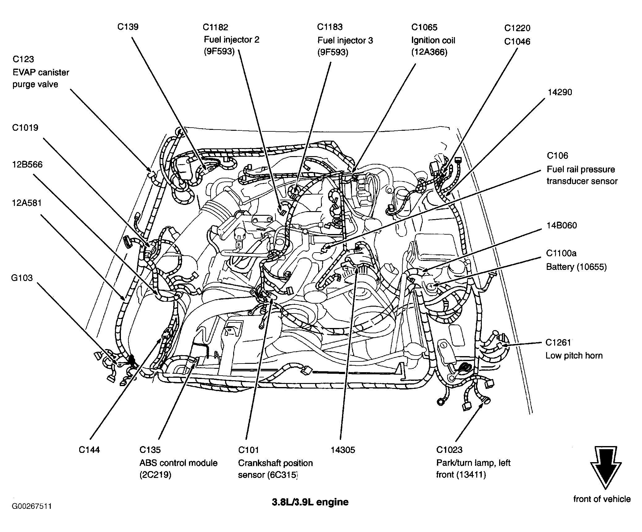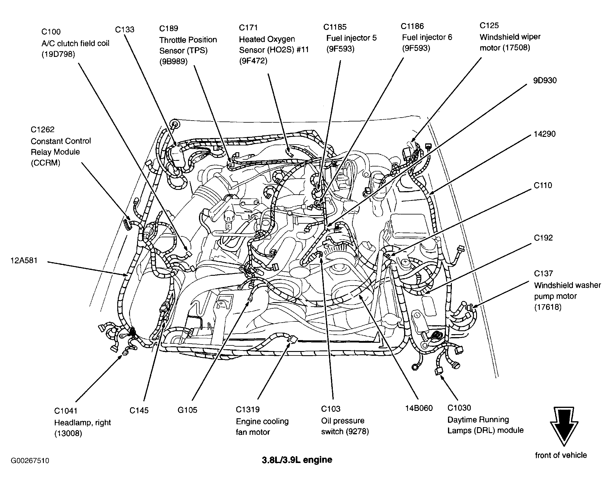 | Daytime Running Lamps Module (3.8L) | Left front corner of engine compartment. See Figure. |