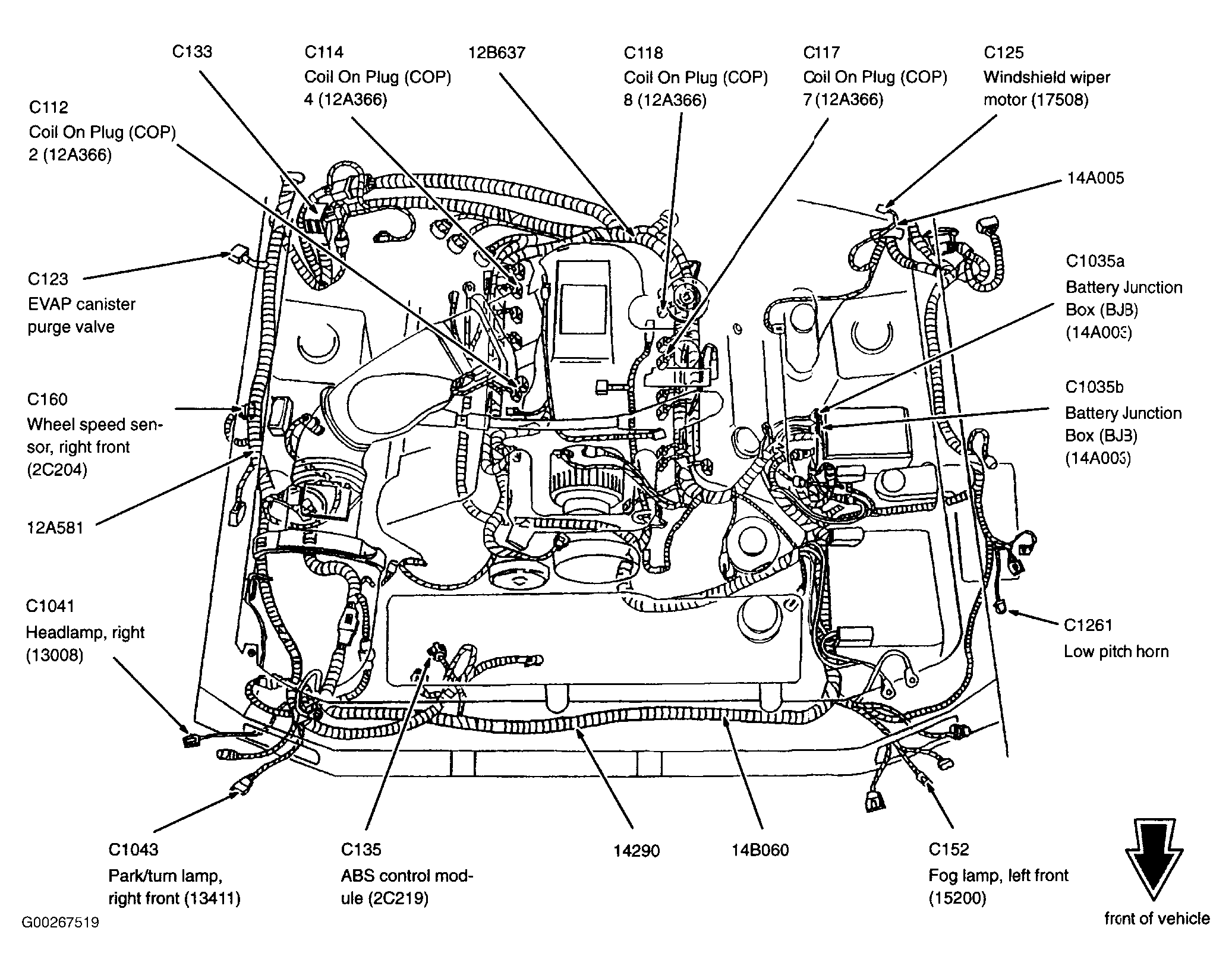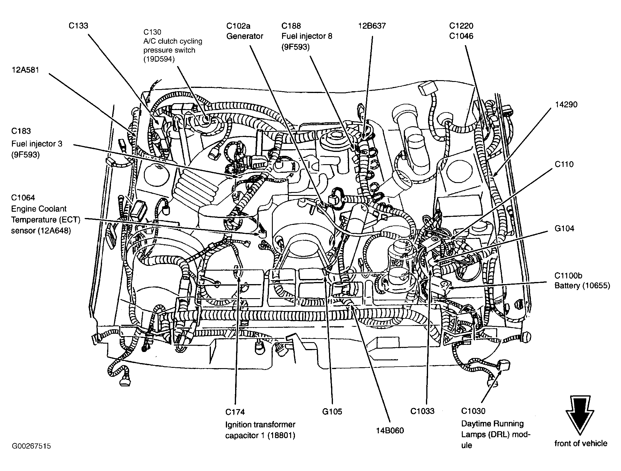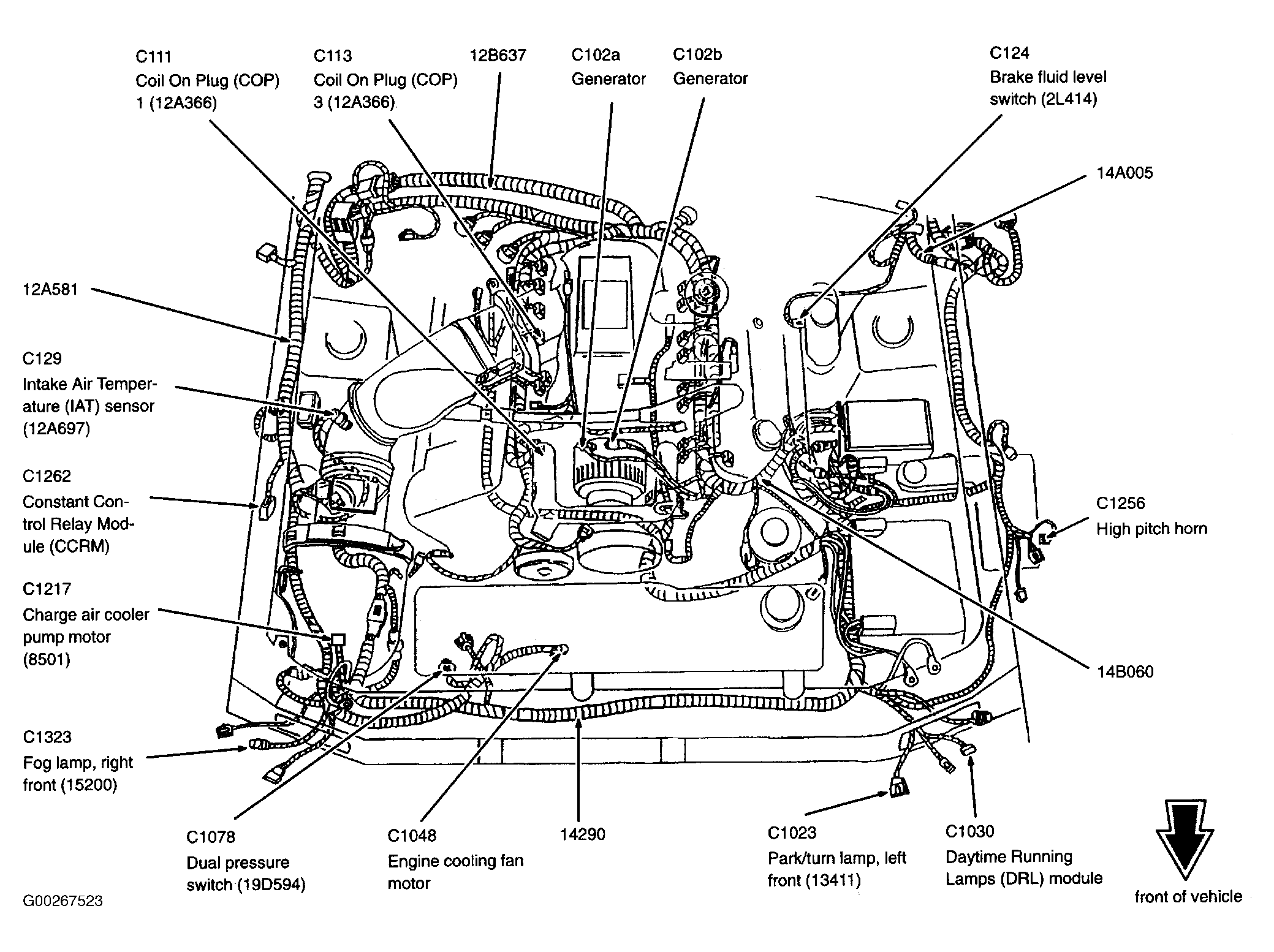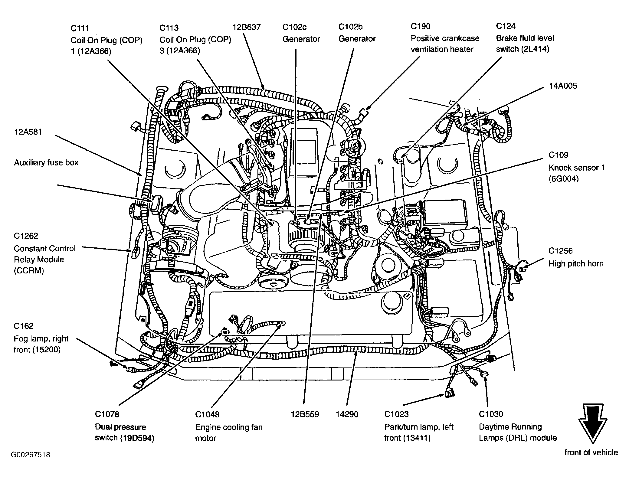 | Daytime Running Lamps Module (4.6L 2V)) | Left front corner of engine compartment. See Figure. |