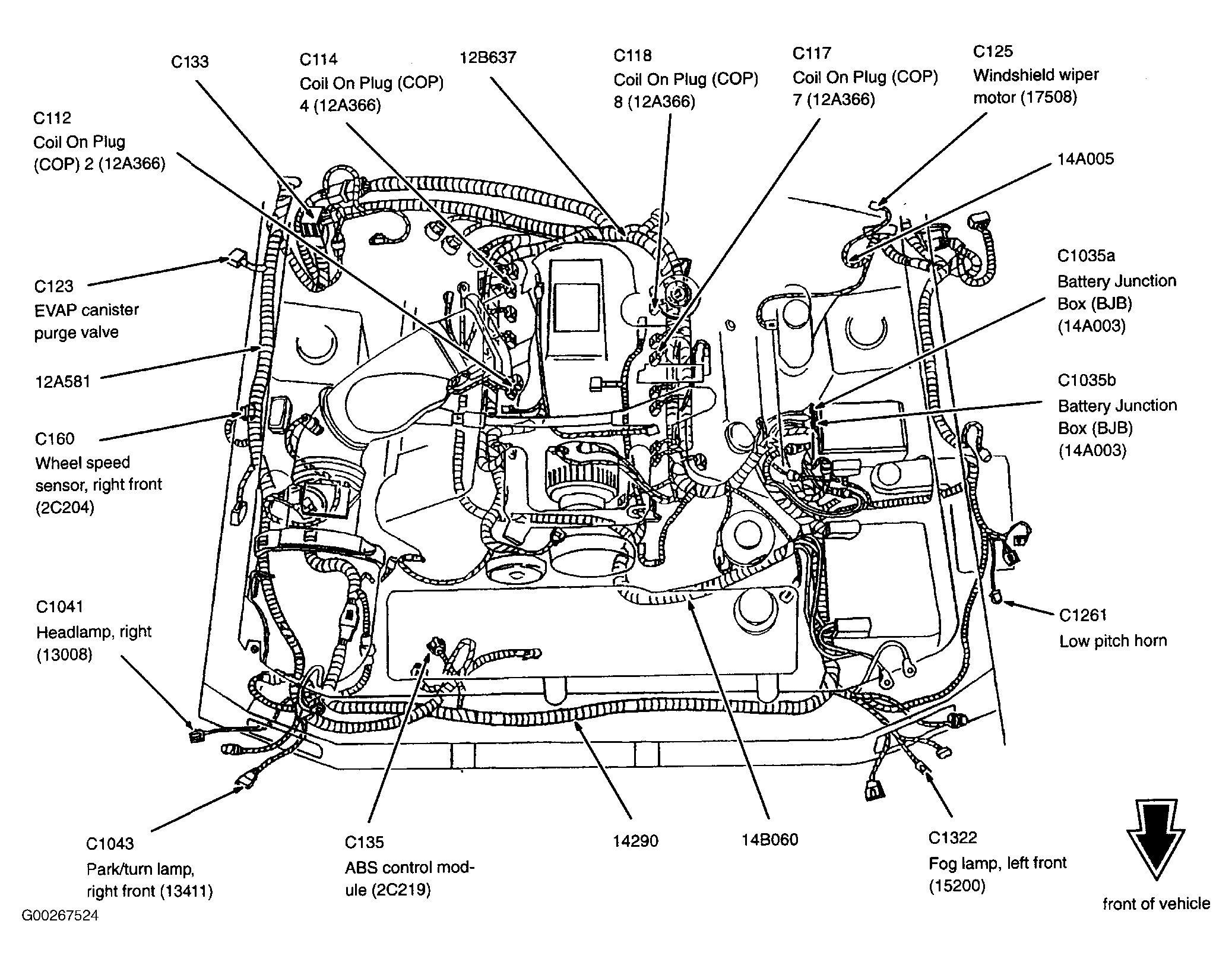 | ABS Control Module (4.6L 2V) | On right front of engine compartment, behind radiator. See Figure. |