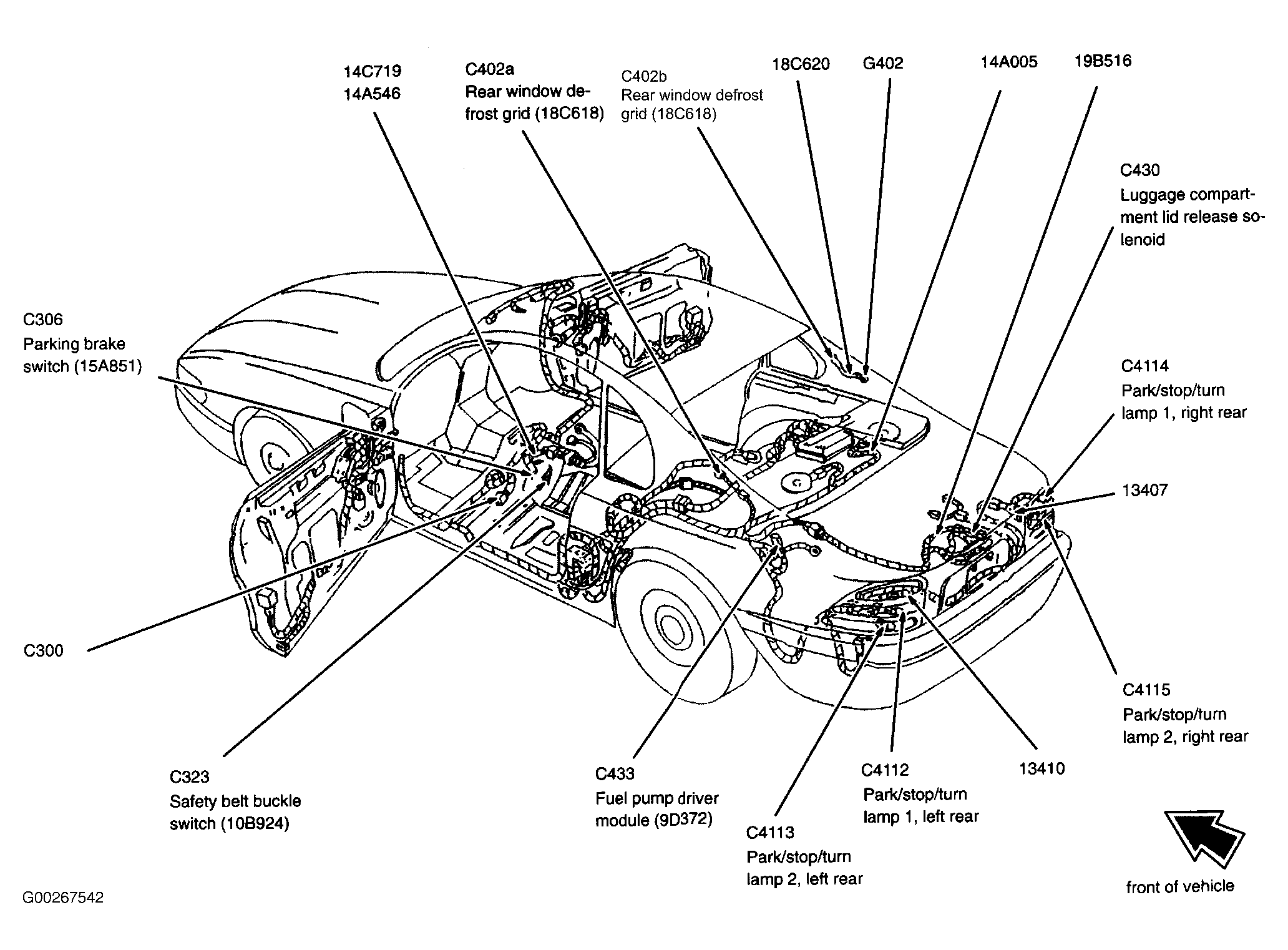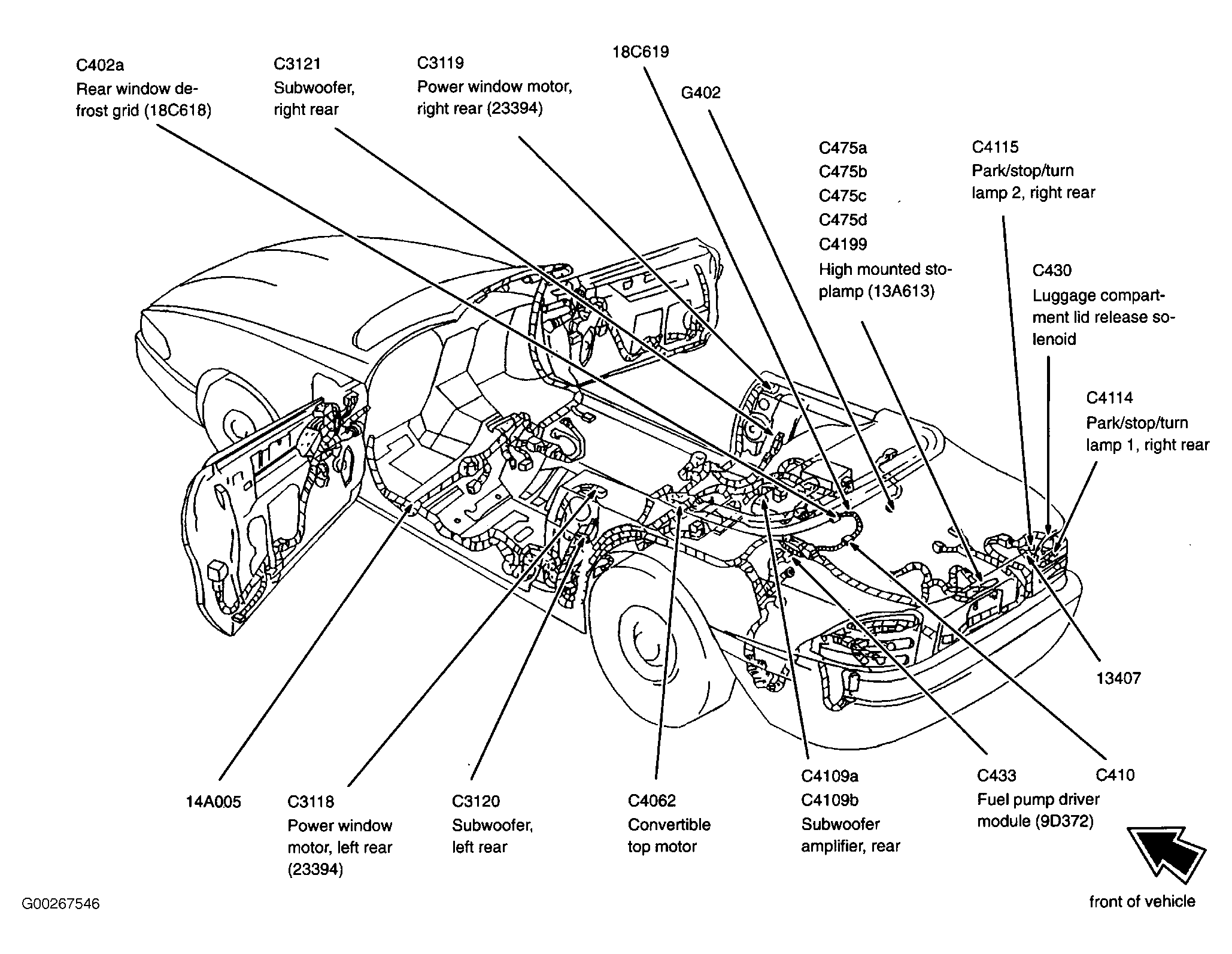 | Fuel Pump Driver Module (Convertible) | Underside of luggage compartment. See Figure. |