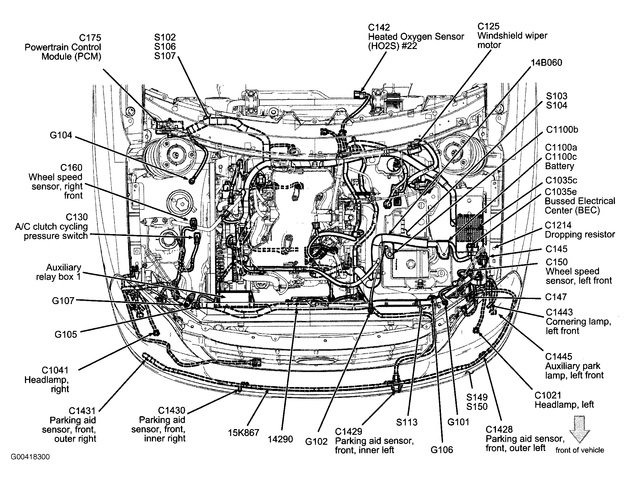 S150 In front parking aid sensor harness, near breakout to left outer parking aid sensor. See Figure.