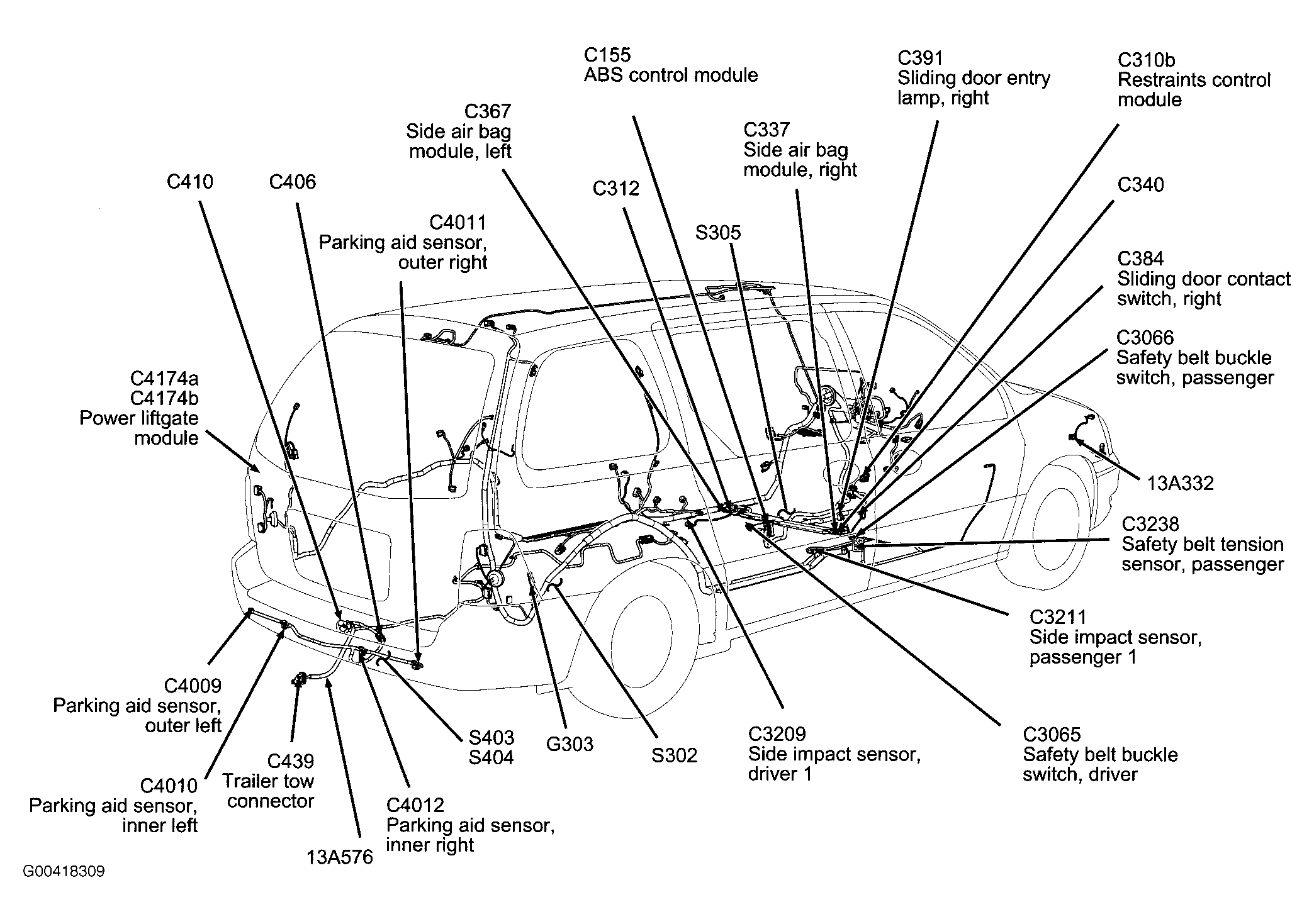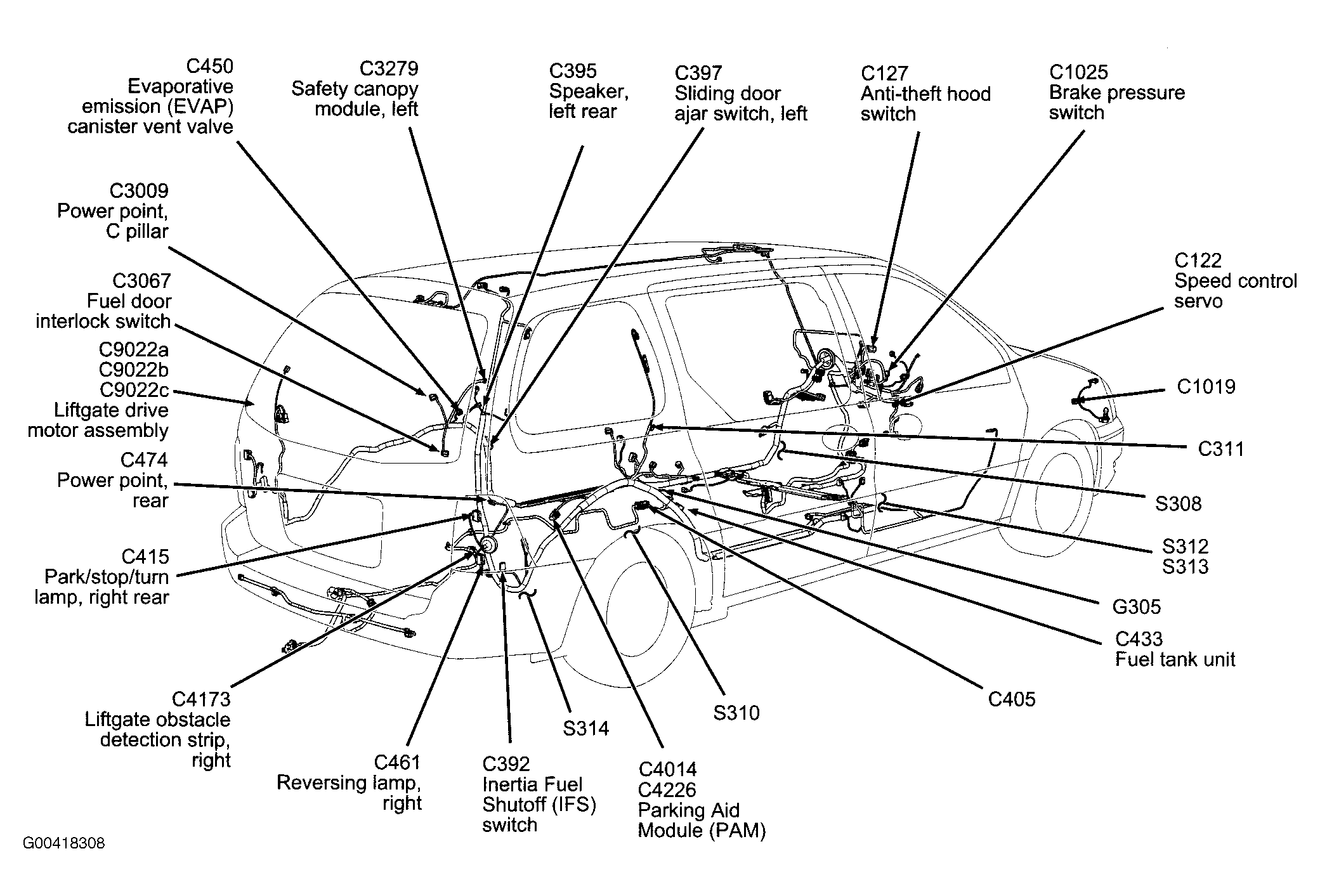 S310 In body main harness, near breakout for power liftgate module. See Figure.