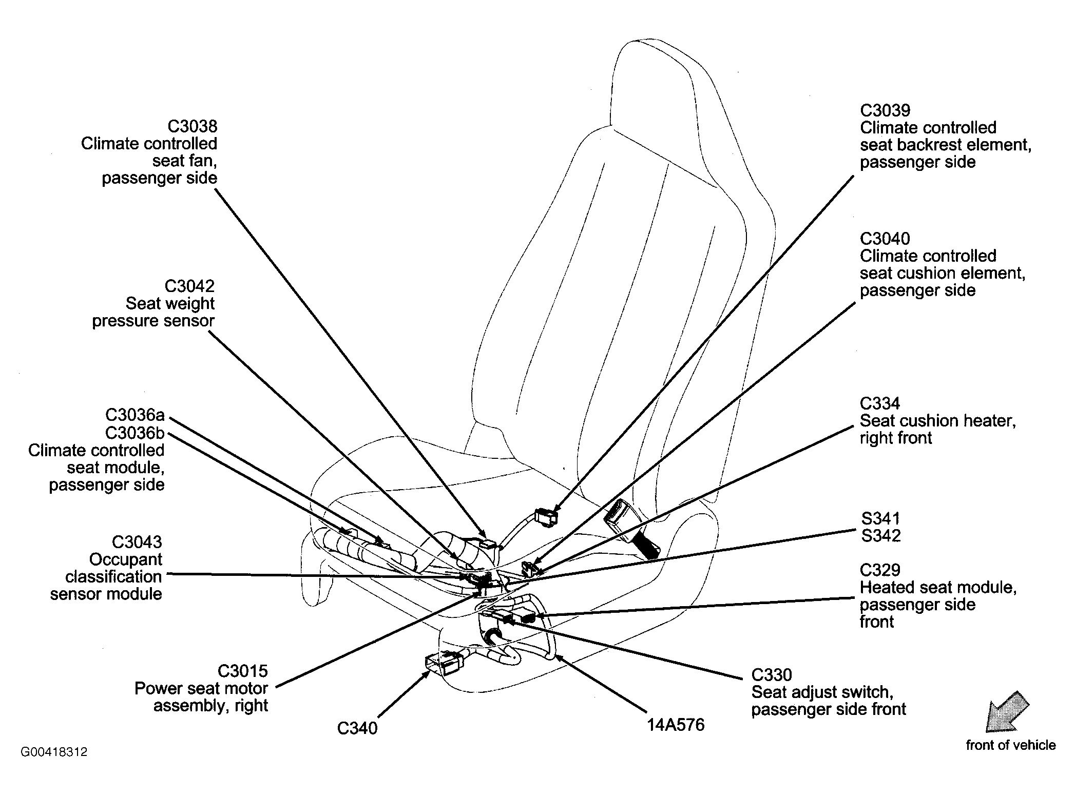 S342 In passenger seat sensor harness, near breakout to passenger heated seat module. See Figure.