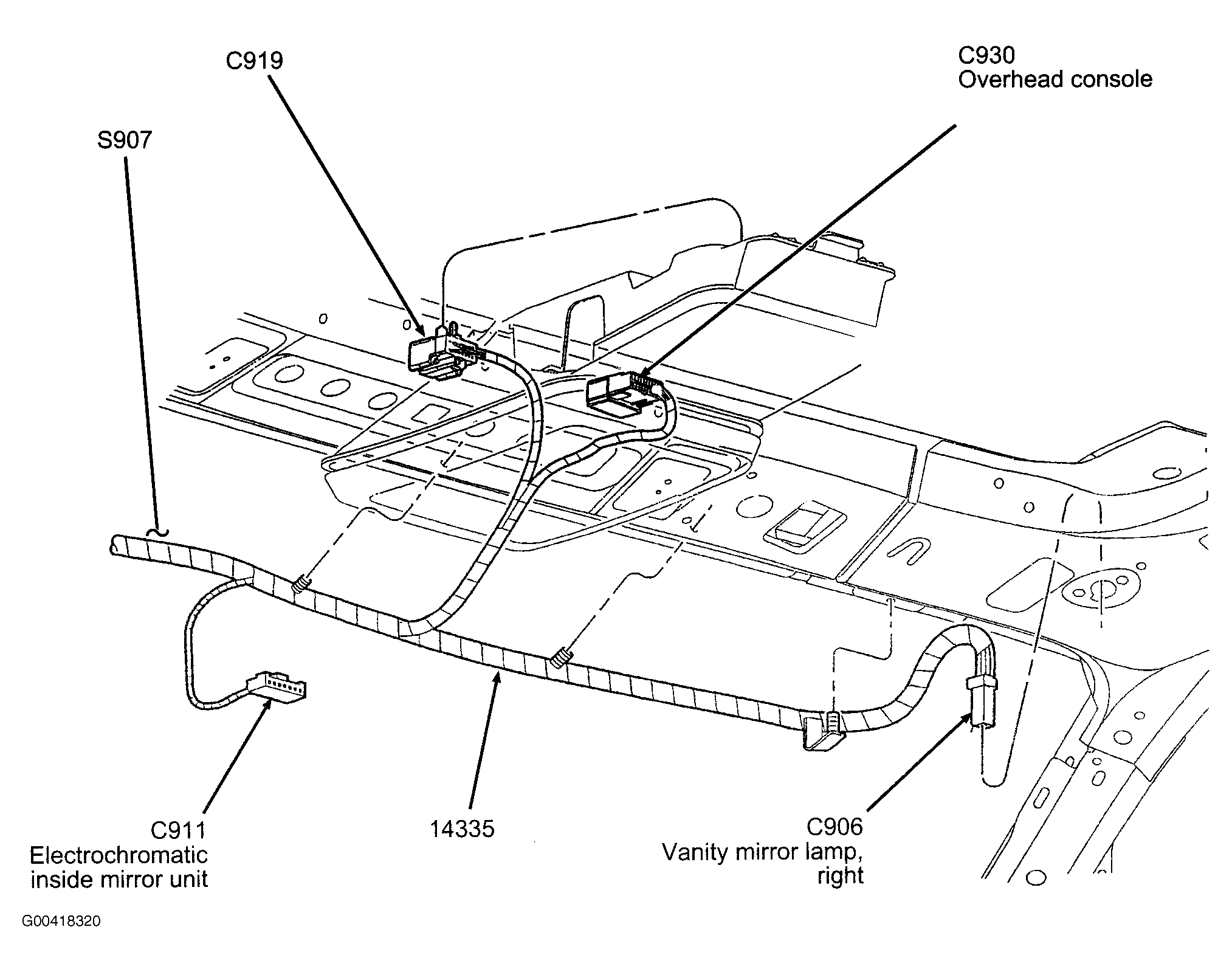 S907 In interior illumination harness, near breakout for C913. See Figure.