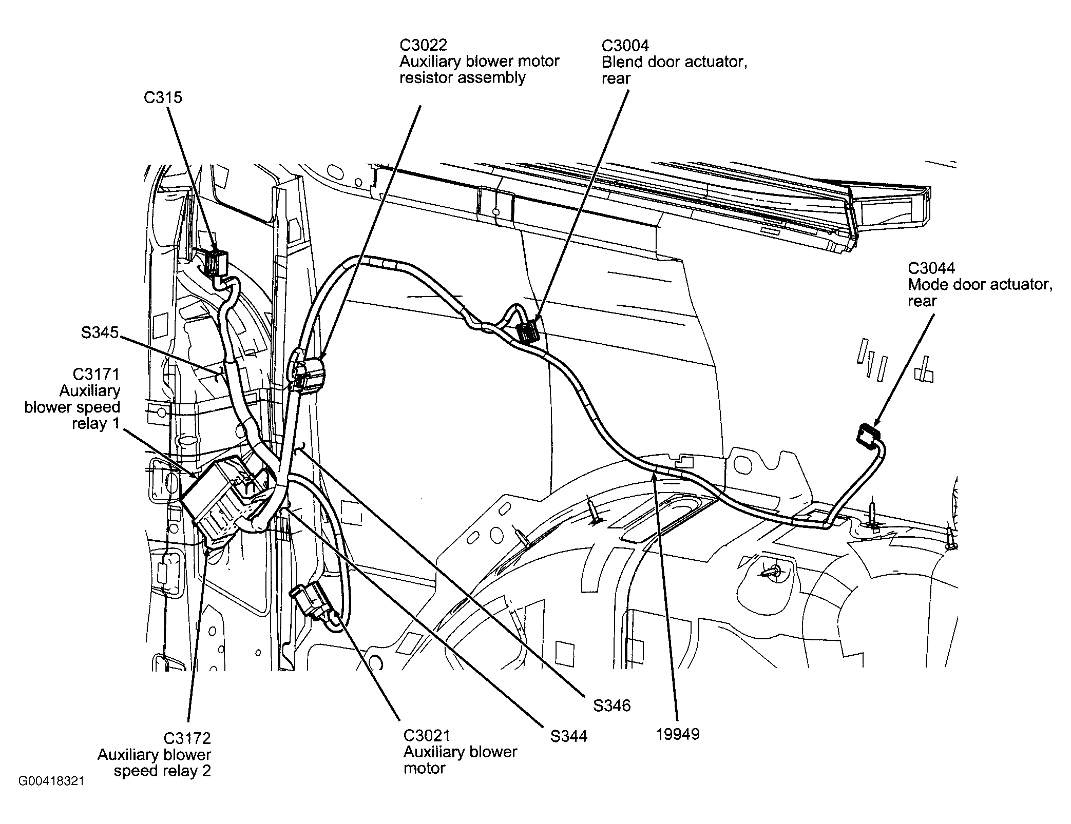 S346 In A/C blower motor harness, near breakout to aux blower motor. See Figure.