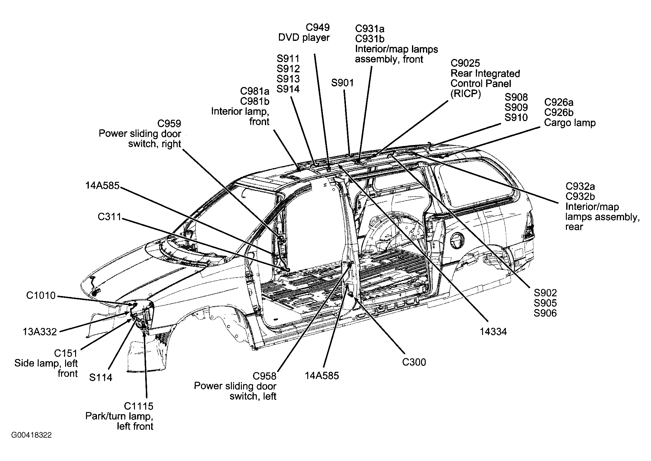 S914 In interior lamps harness, in breakout for C919. See Figure.