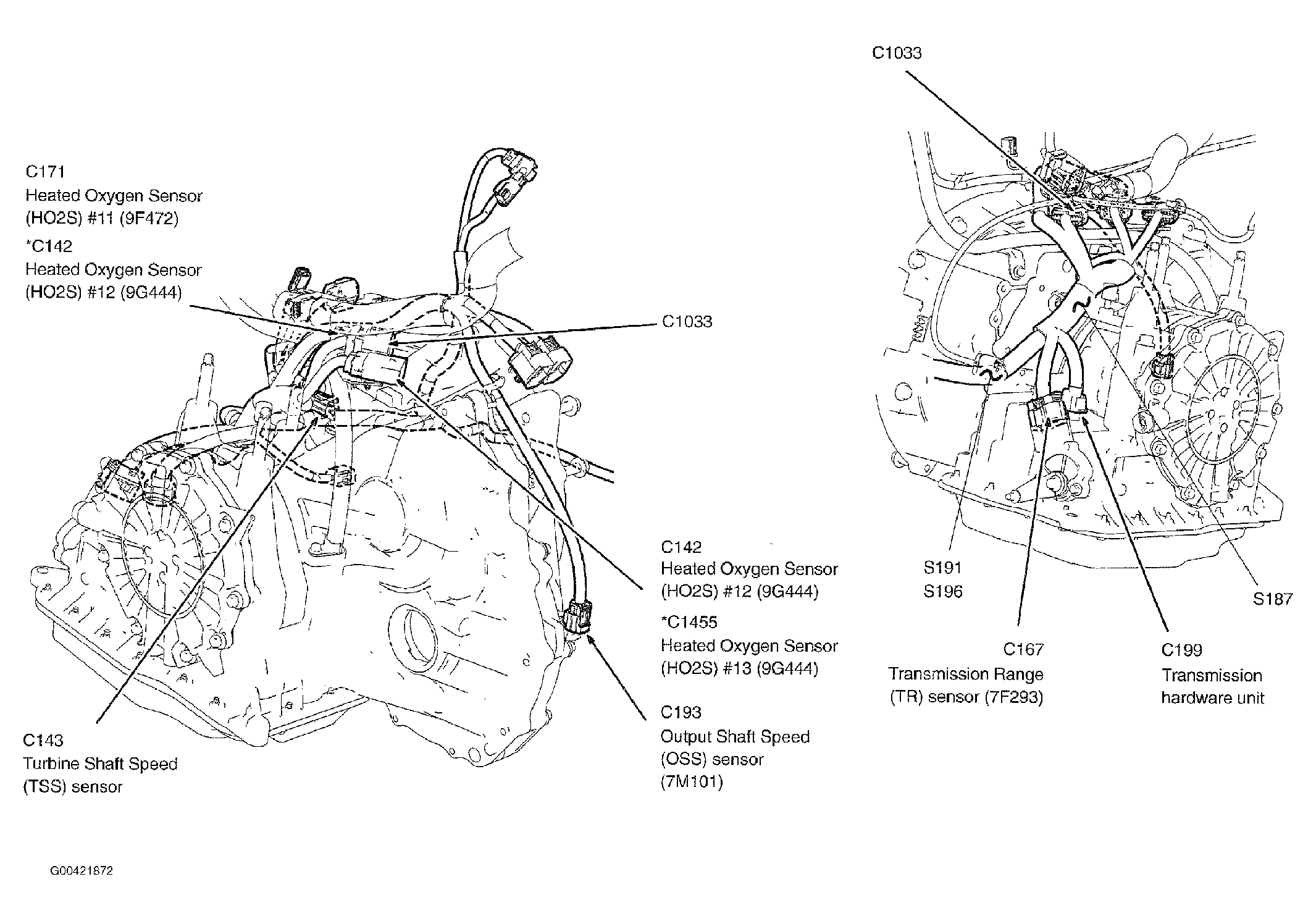 | S187 | In engine control sensor extension wiring harness, near breakout for transmission hardware unit. See Figure. |