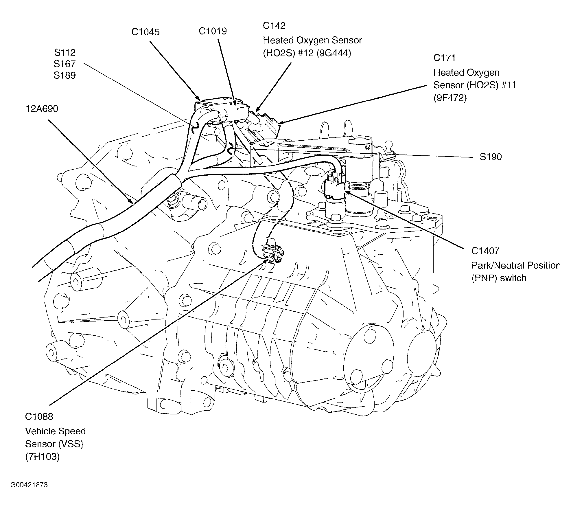 | S112 | In engine control sensor extension wiring harness, at breakout for C1019. See Figure. |
