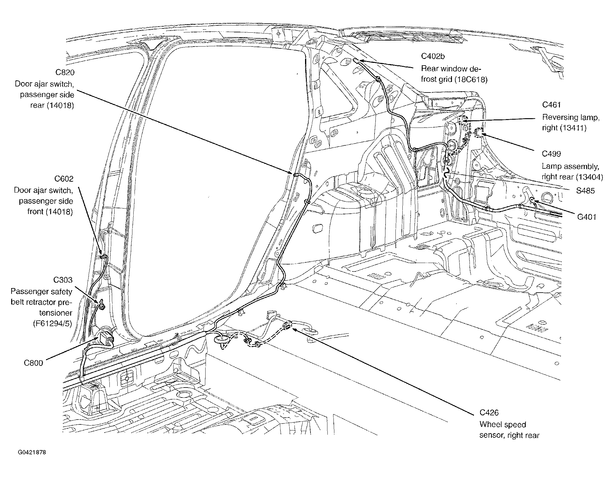 | S401 | In taillights wiring harness, near breakout for G402. See Figure. |