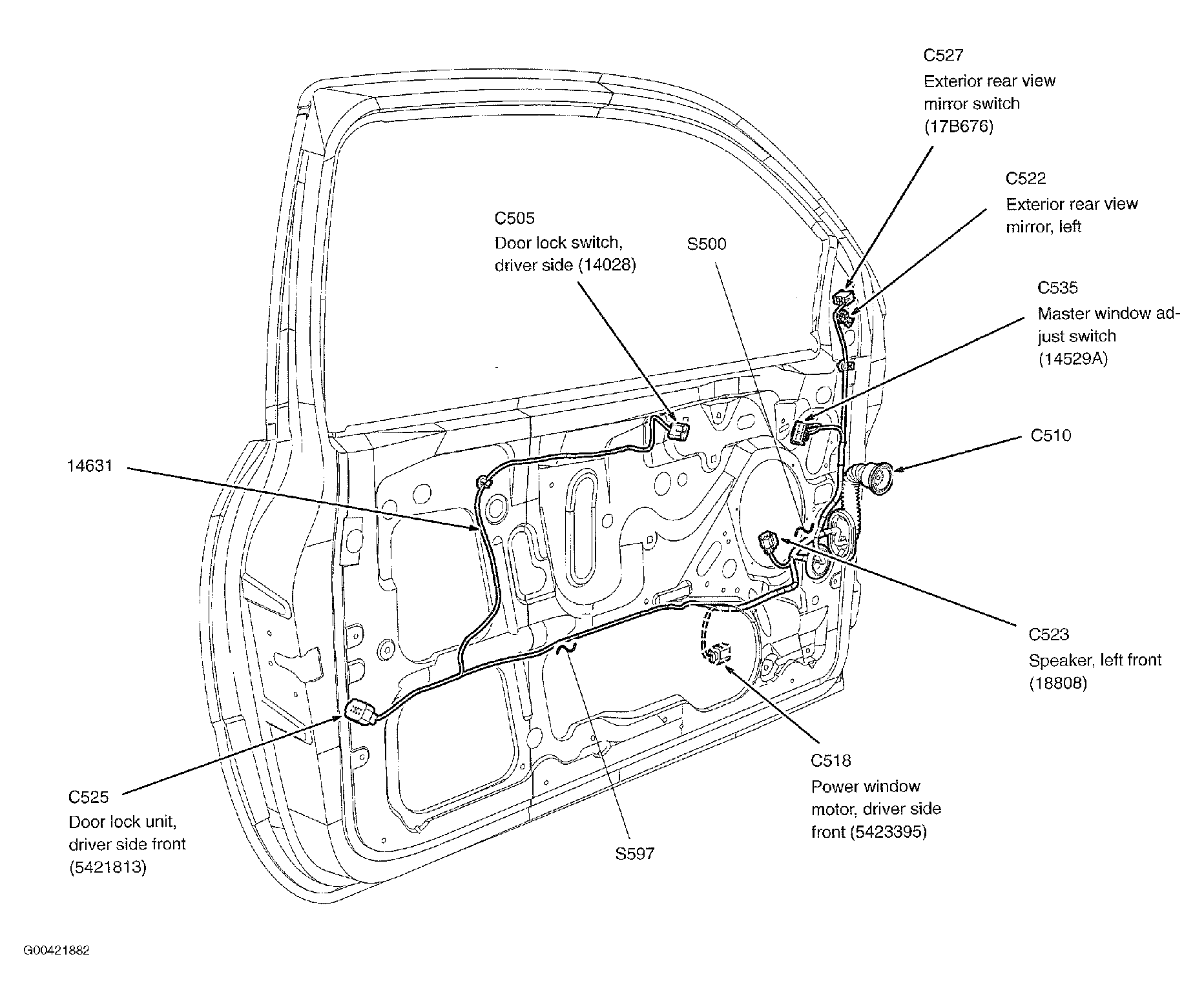 | S501 | In left front door window regulator harness, near breakout for one-touch window relay. See Figure. |