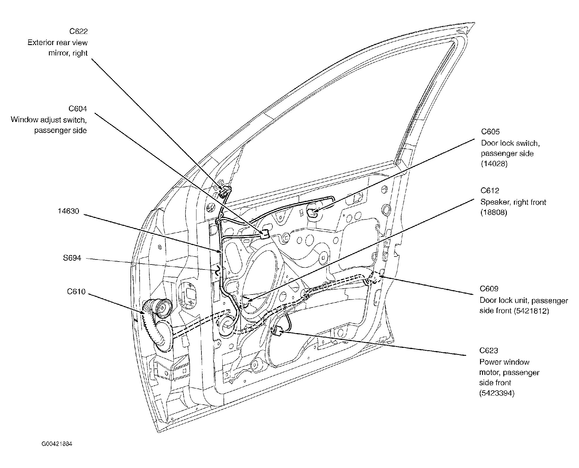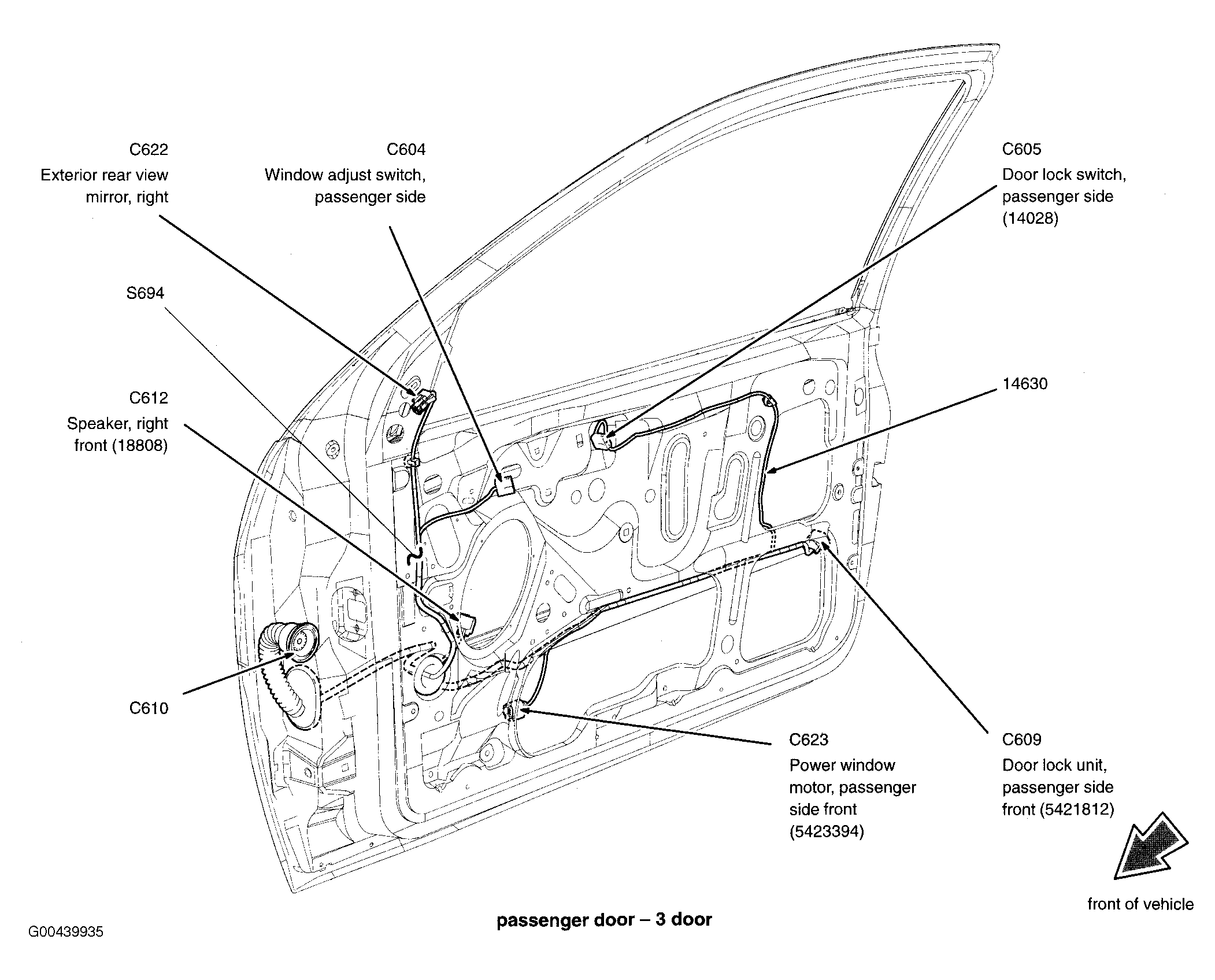 | S694 (3 Door) | In right front door window regulator harness, near breakout for door lock switch. See Figure. |