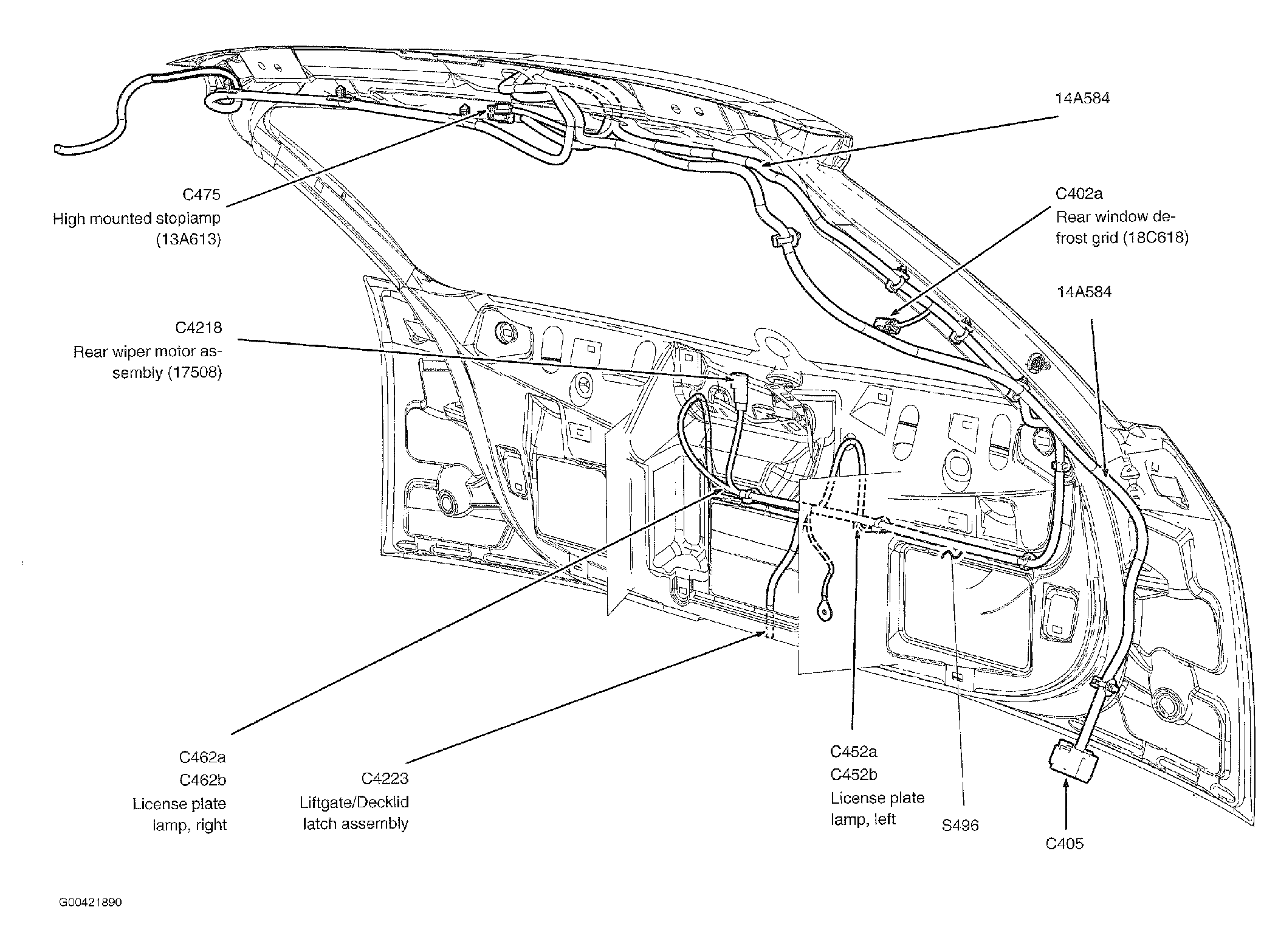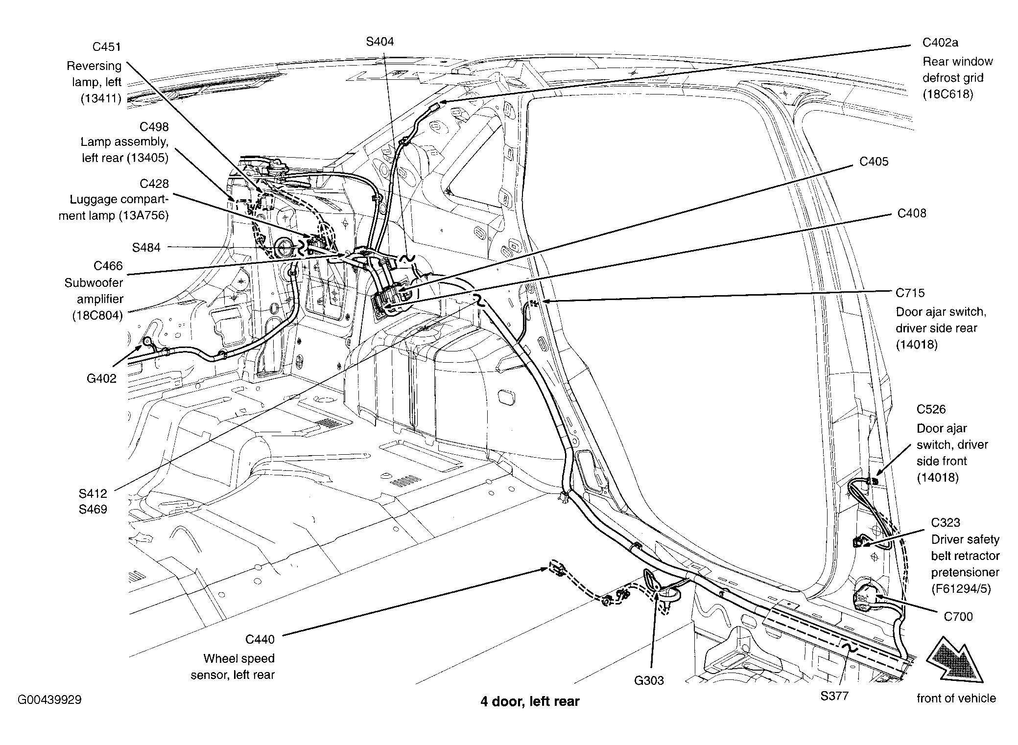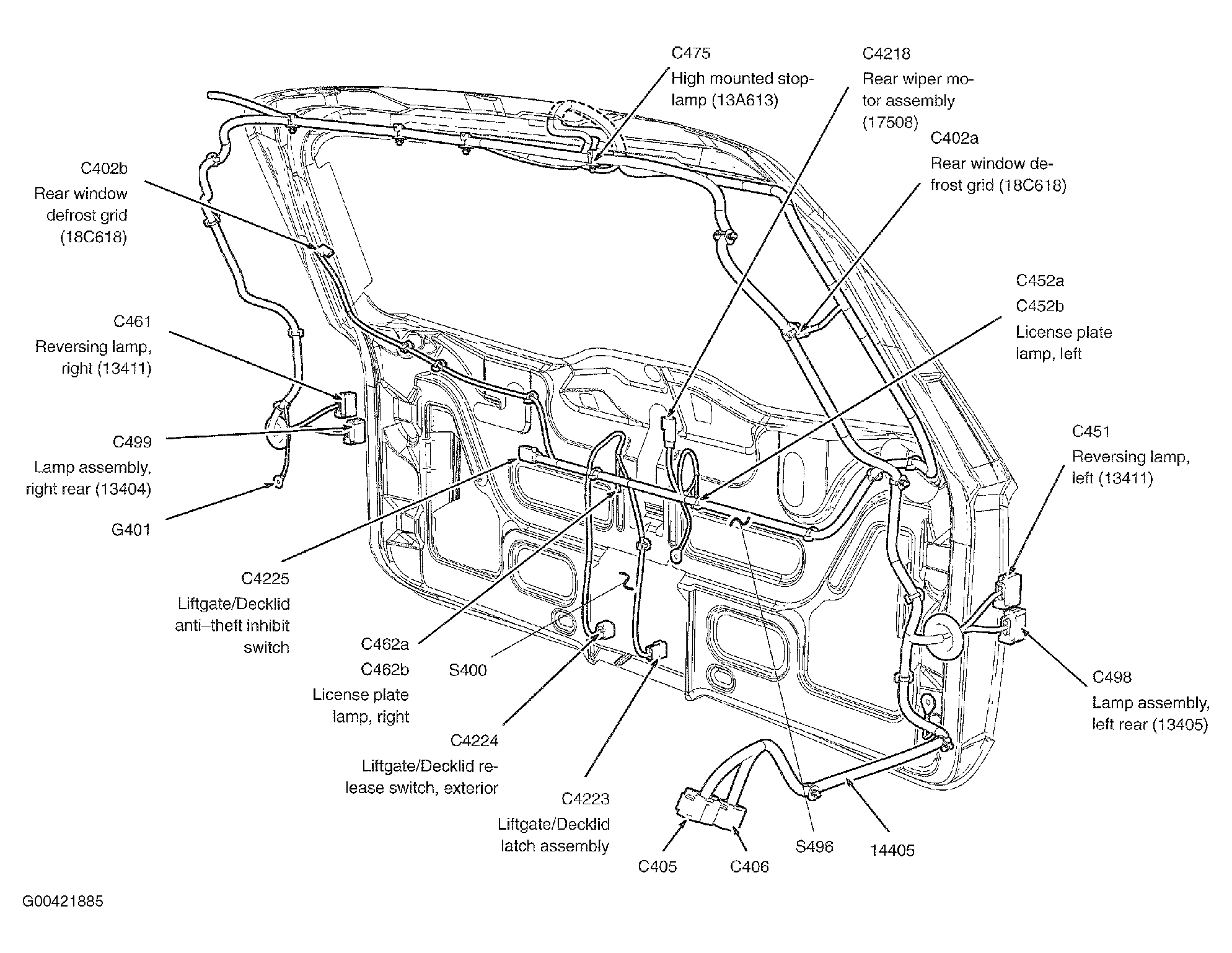 | S400 | In taillights wiring harness, in breakout to liftgate/deck lid latch assembly. See Figure. |