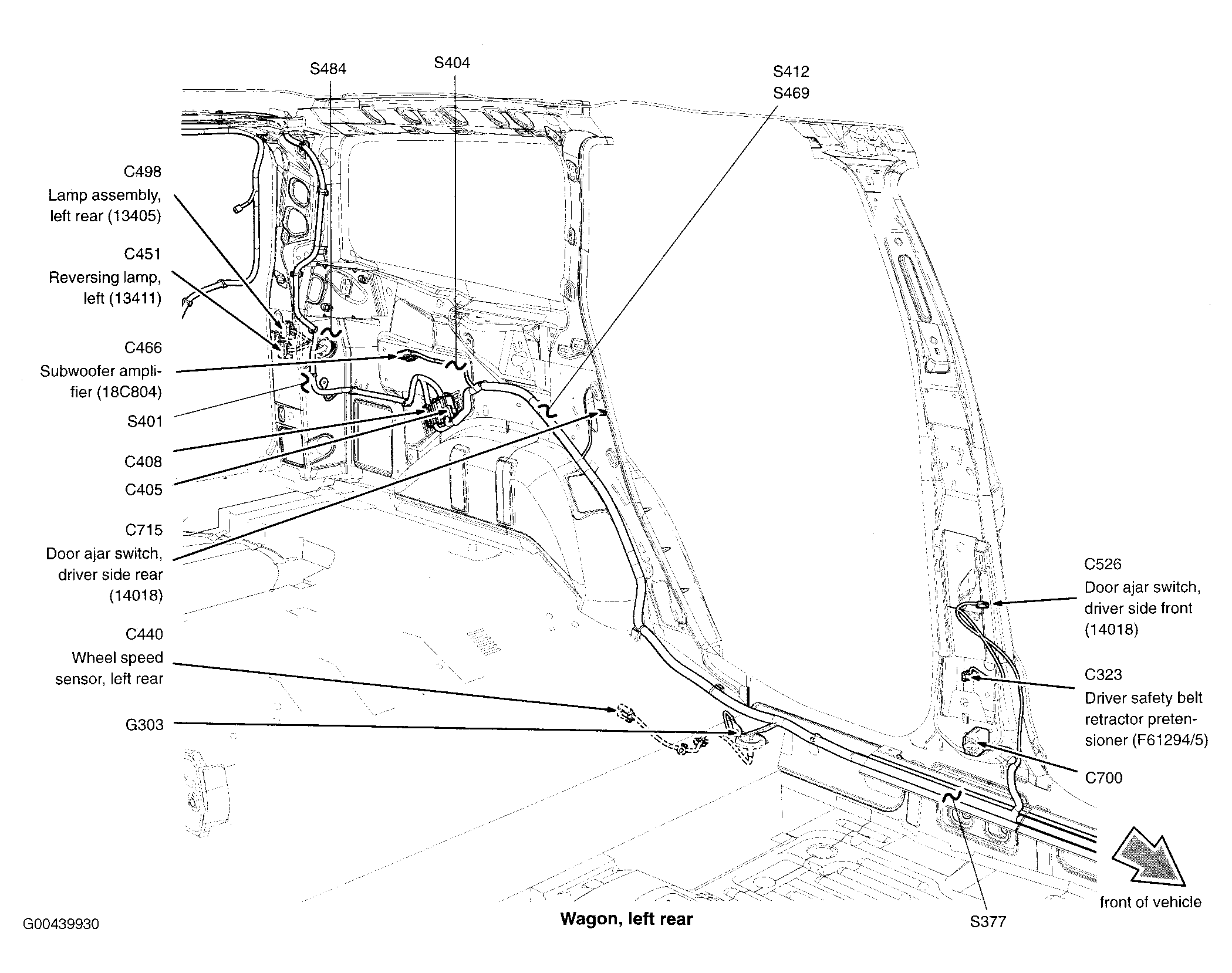 | S469 (Wagon) | In door lock feed wiring harness, near breakout to left rear door ajar switch. See Figure. |