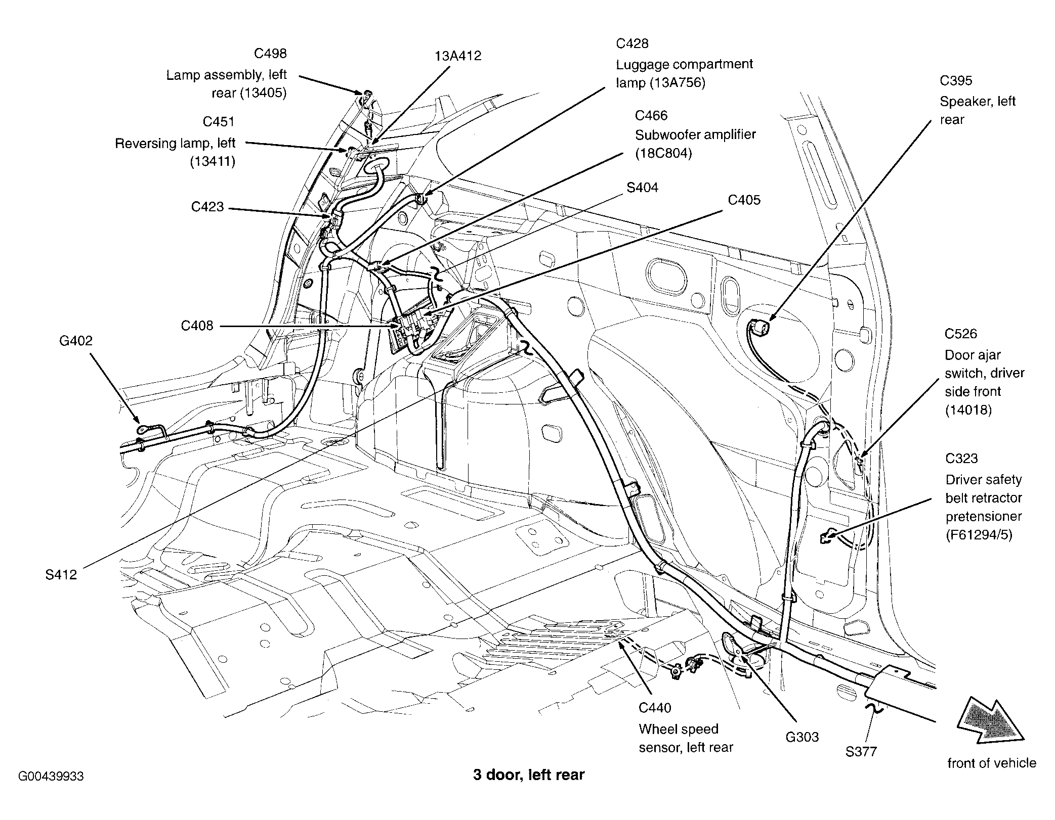| S412 (3 Door) | In taillights wiring harness, near breakout to C408. See Figure. |
