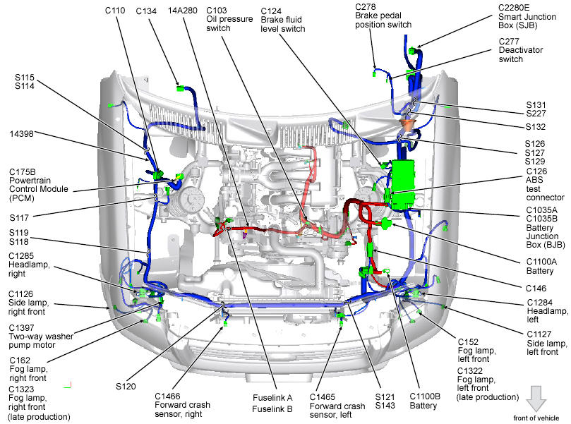 | Battery Junction Box (BJB) | Left side of engine compartment, at fender apron. See Figure. |