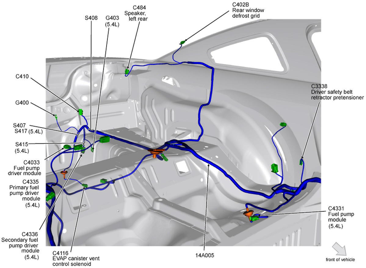 | Primary Fuel Pump Driver Module (5.4L) | Top left rear of fuel tank. See Figure. |