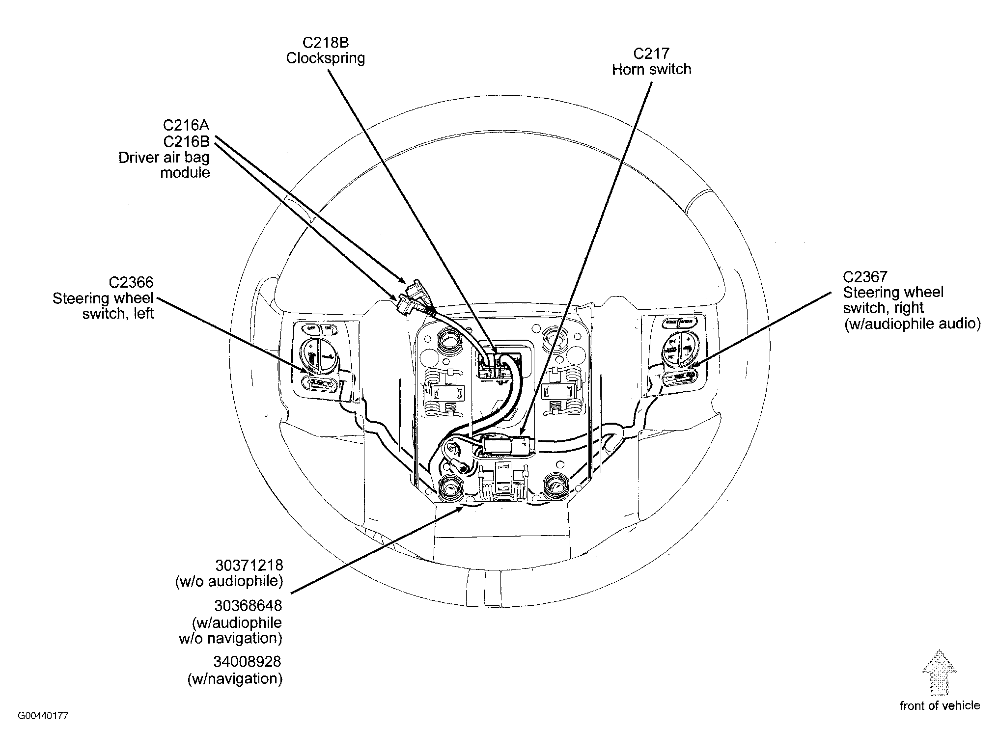 Driver Air Bag Module Center of steering wheel. See Figure.