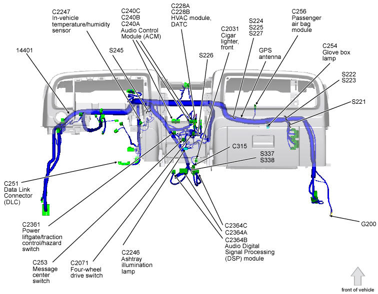 Passenger Air Bag Module (Expedition) Behind right side of dash. See Figure.