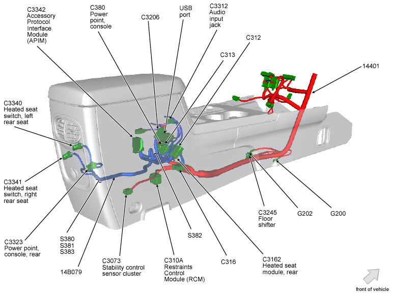 Accessory Protocol Interface Module (APIM) Under center console. See Figure.
