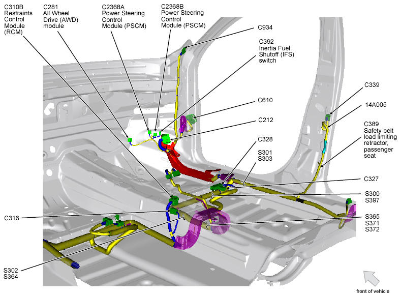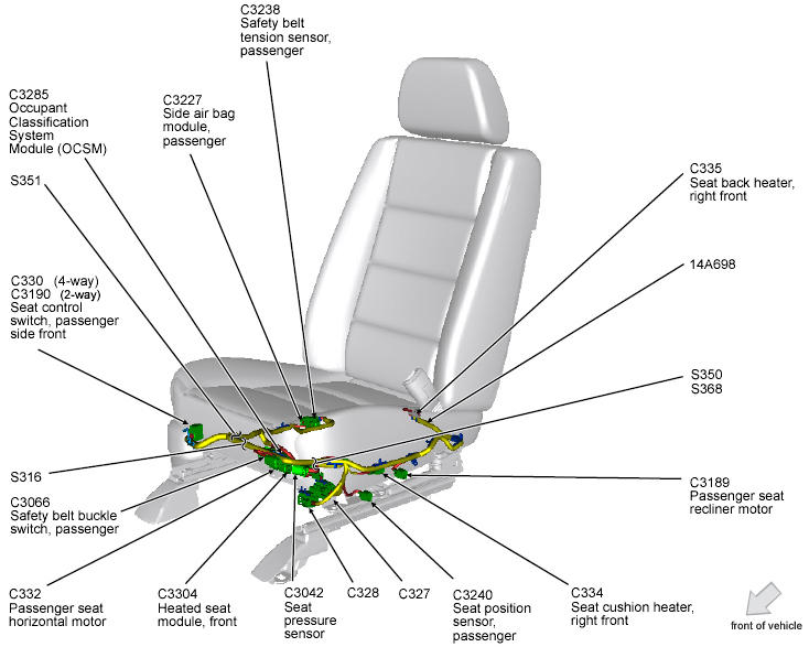 Occupant Classification System Module (OCSM) Under front passenger's seat. See Figure.