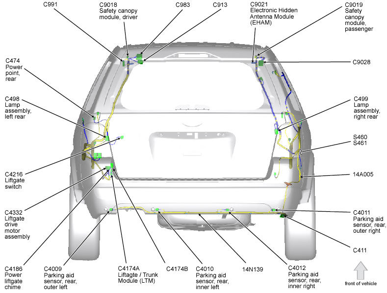 Parking Aid Module (PAM) (Taurus X) Top of right "C" pillar. See Figure.