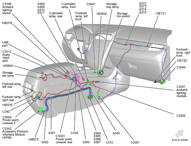 | Accessory Protocol Interface Module (APIM) | Under rear of center console. See Figure. |