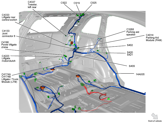 | Liftgate/Trunk Module (LTM) | Base of left "D" pillar. See Figure. |