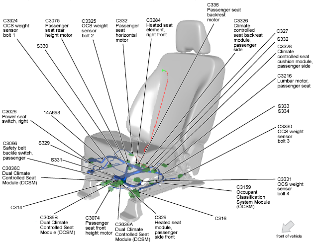 | Climate Controlled Seat Module (Passenger Side) | Under front passenger's seat. See Figure. |