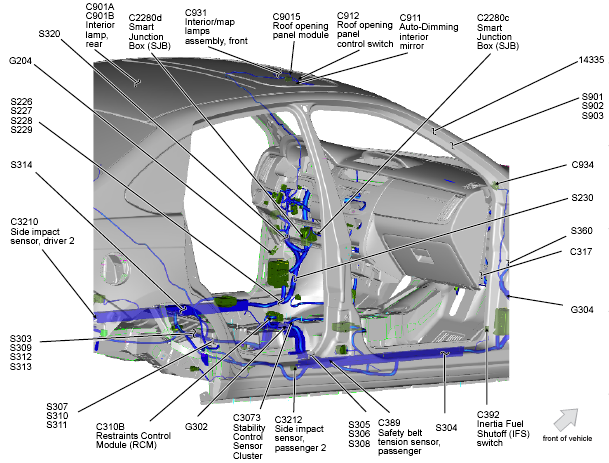 | Occupant Classification System Module (OCSM) | Under front passenger's seat. See Figure. |