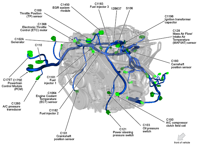| Powertrain Control Module (PCM) | Right front of engine compartment. See Figure. |