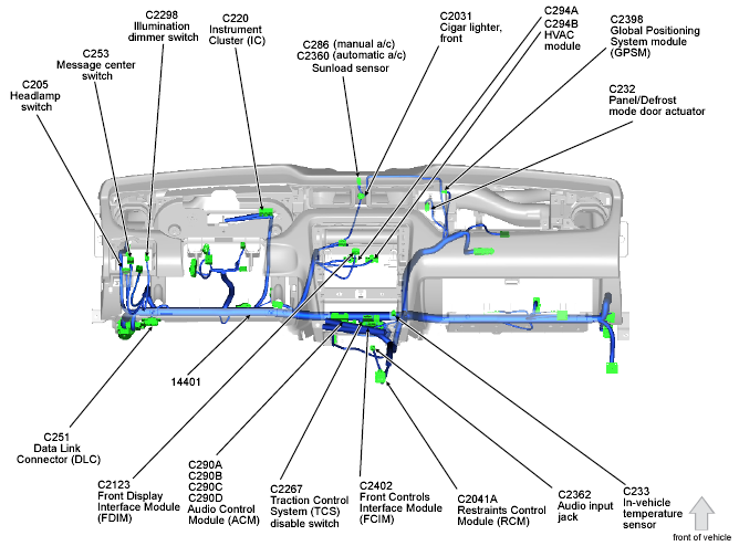 | Front Controls Interface Module (FCIM) | Lower center of dash. See Figure. |