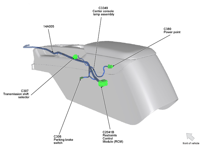 | Restraints Control Module (RCM) | Under center console. See Figure. |