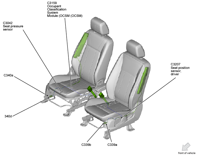 | Occupant Classification System Module (OCSM) | Under passenger's seat. See Figure. |