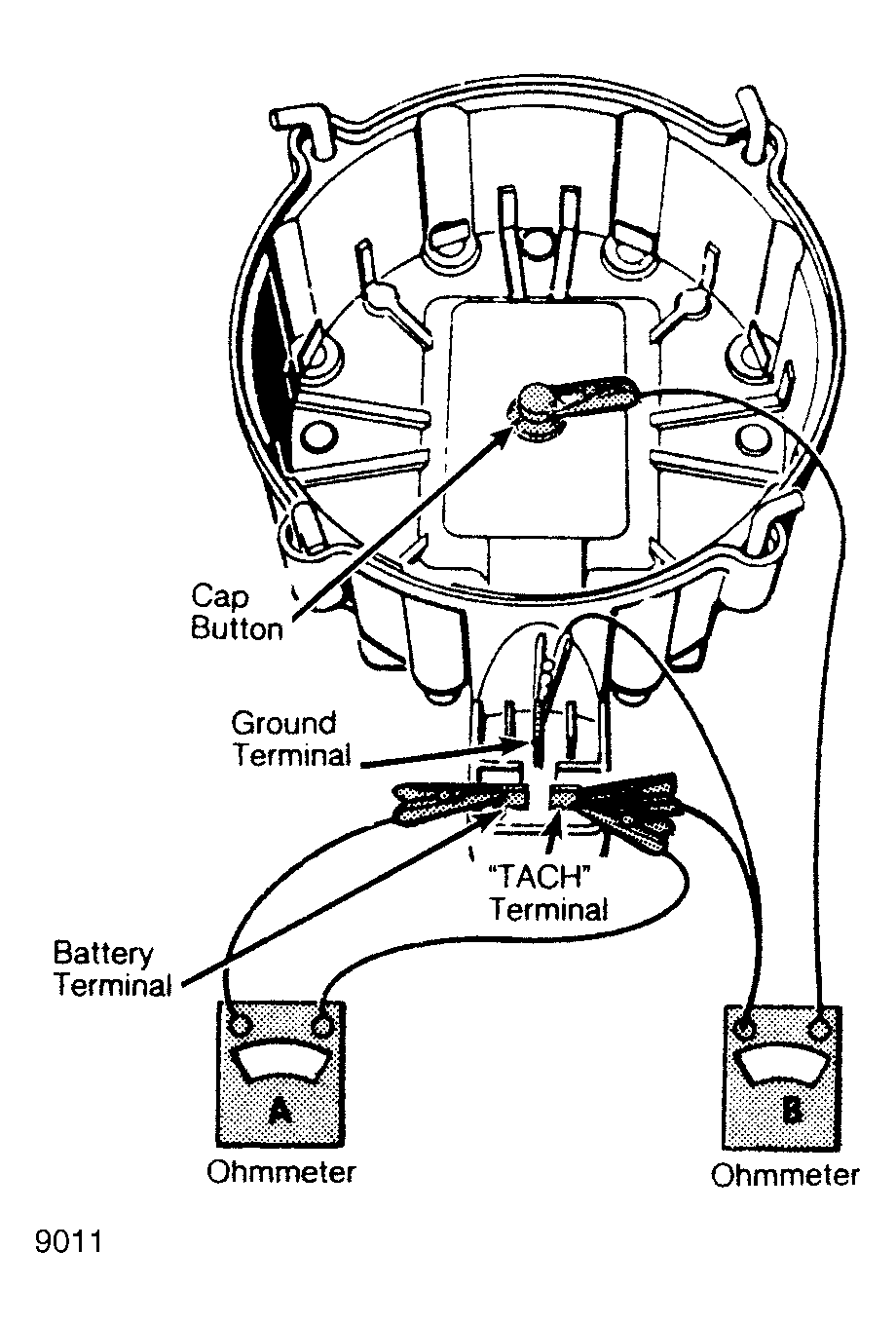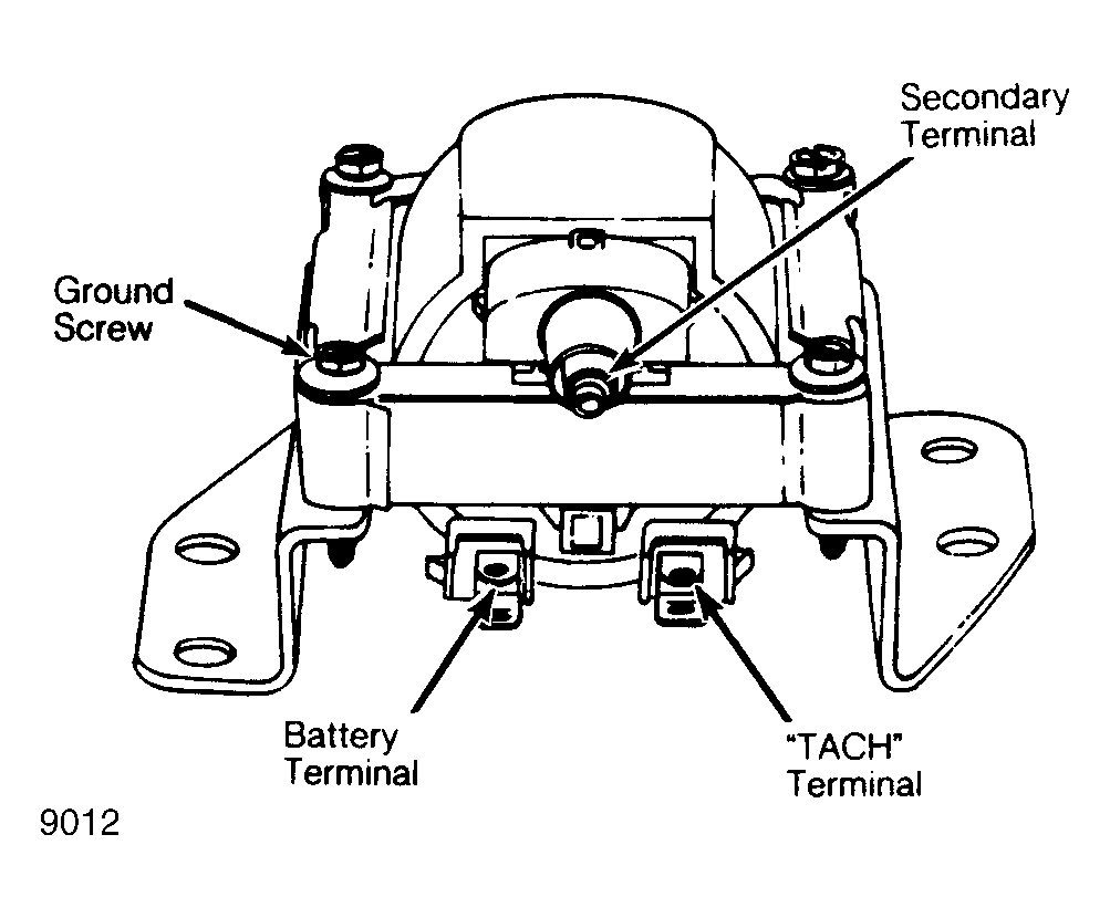 - Connect ohmmeter leads to "TACH" terminal and ground, and note reading. Next, test coil secondary resistance by connecting ohmmeter leads to coil secondary contact (cap button) and "TACH" terminal. See Fig 1. Replace coil only if both readings are infinity.