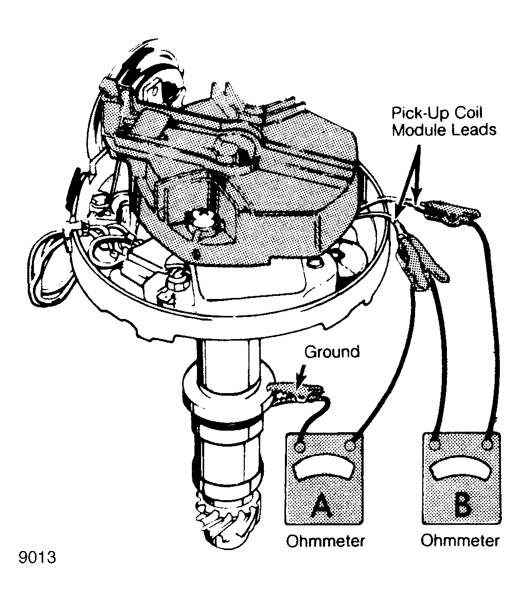 - To check pick-up coil resistance, connect ohmmeter leads as shown by meter "B" in Fig 1. Again use the middle scale. Operate vacuum advance through its range. Ohmmeter reading should be 500-1500 ohms in all advance positions. If readings are not as specified, replace pick-up coil.