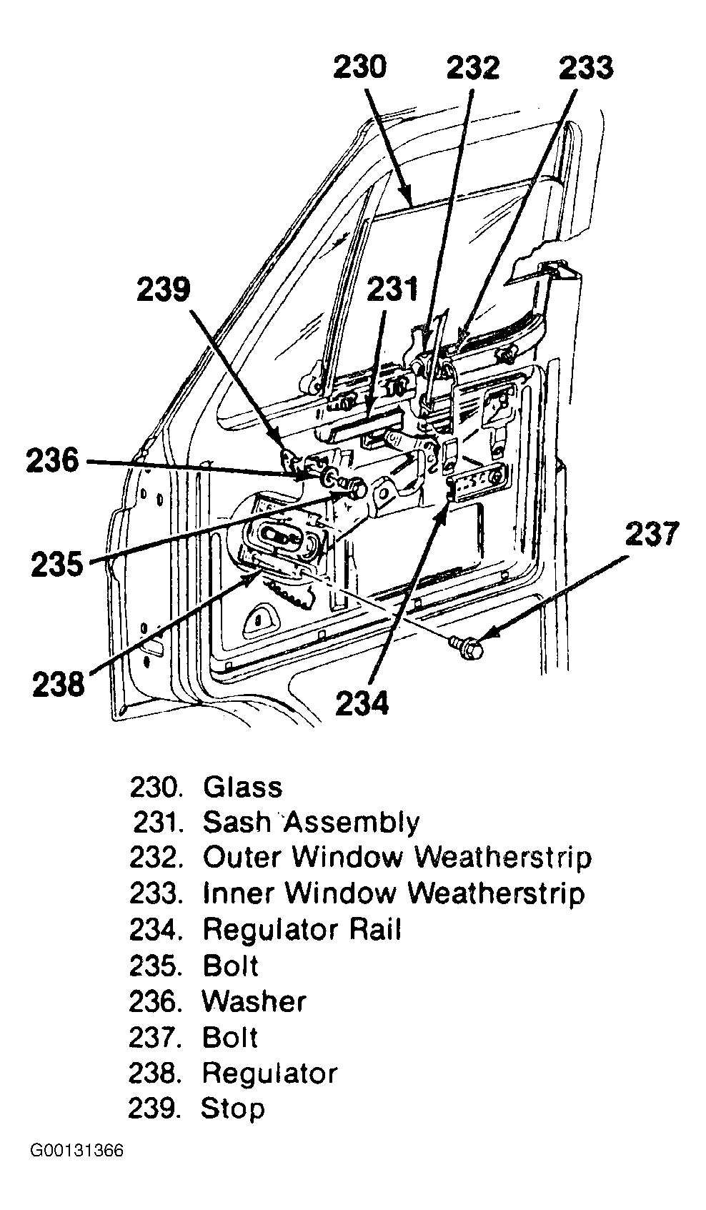 - Loosen the glass stop bolt (235), and adjust the stop (239) until the glass is completely flush with the window sill. See Figure . See TORQUE SPECIFICATIONS .