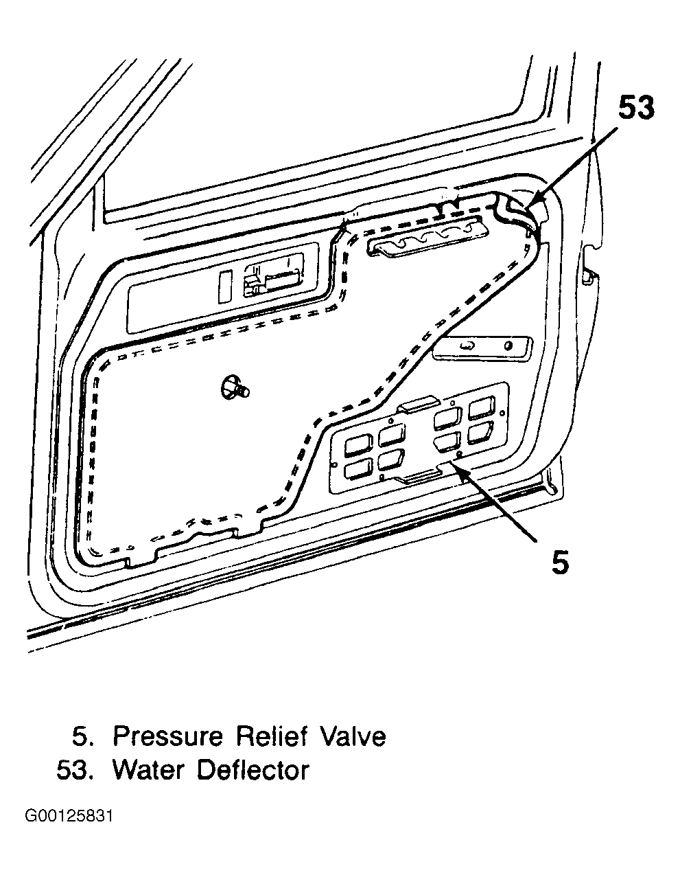 Water deflectors are used to seal the door inner panel and prevent water from entering into the body. The deflector is secured with a self sealing adhesive. See Figure .
