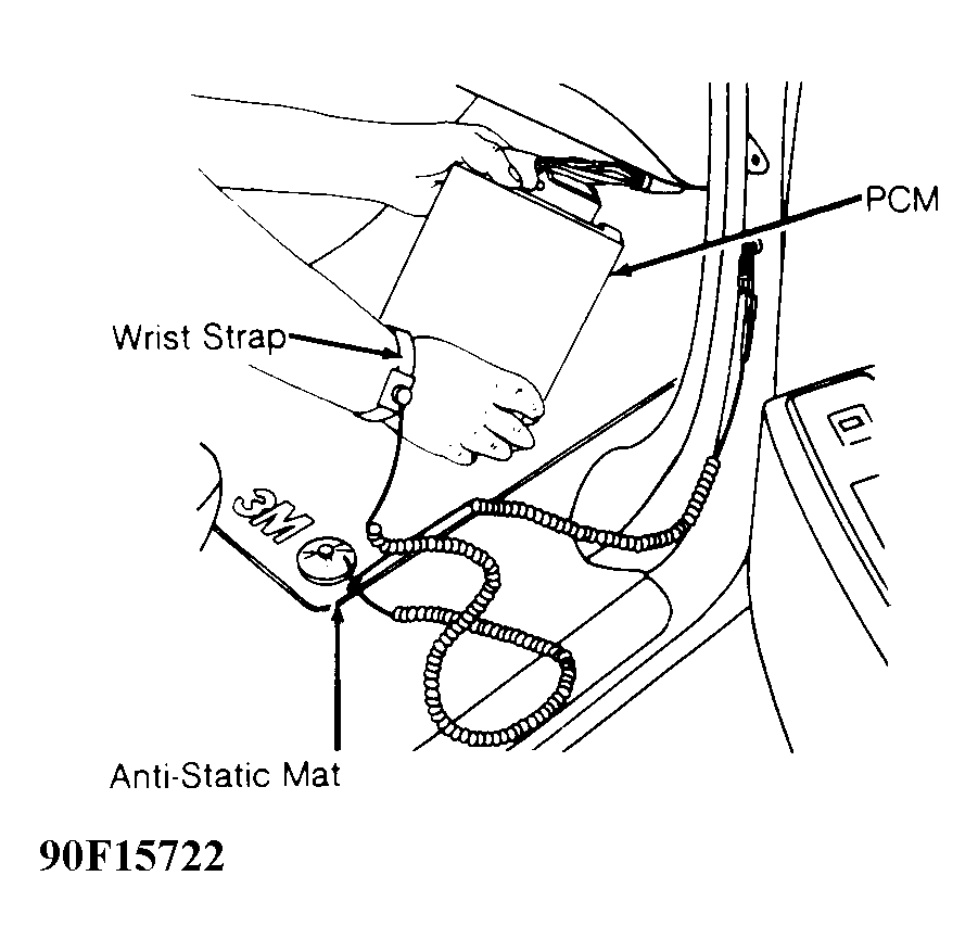 CAUTION: When certain materials rub together, a transfer of electrons from one material to another may occur under special conditions. This causes electrostatic charge (static electricity) build-up in one of the materials. When any conducting material comes in contact with the charged material, electrostatic discharge occurs, transferring electrons to the third material. Electronic components used in control systems are designed to carry very low voltages; a 30-volt charge created by static electricity can cause a total or degrading failure in PCM or other electronic components containing integrated circuits. Before servicing PCM, ground yourself, and ground the work area to discharge stored electricity.