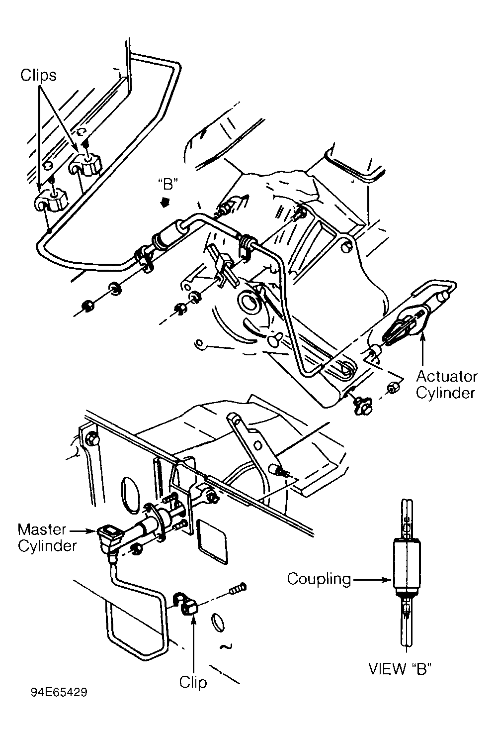 The hydraulic line joining master cylinder to actuator cylinder has a coupling located near left rear of engine. This coupling contains internal check valves that allow master cylinder half of system to be disconnected from actuator half without loss of fluid. The coupling can be reconnected and no bleeding is required. service replacement master and actuator cylinder components are furnished pre-filled with fluid. See Fig 2 .
