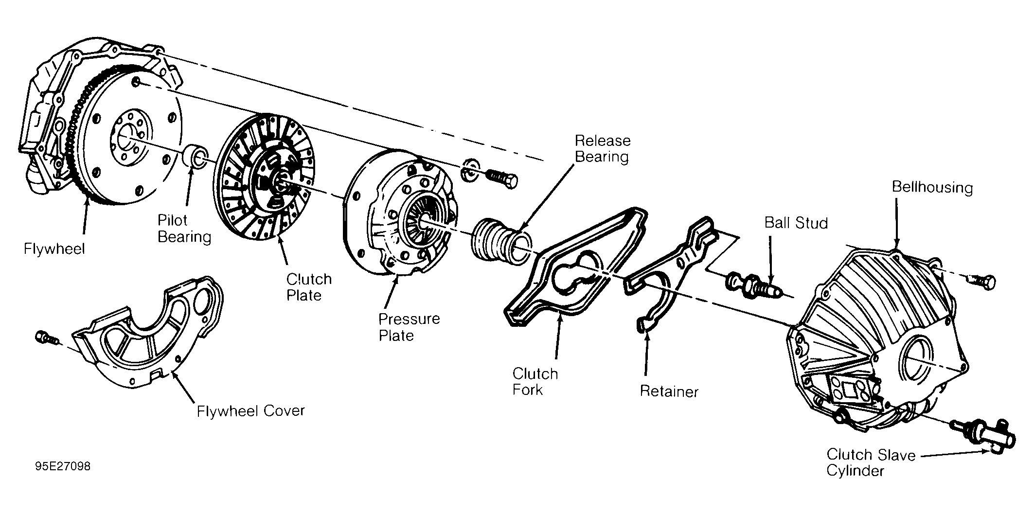 The hydraulic clutch consists of a clutch plate, pressure plate and pilot bearing. Hydraulic clutch has a master cylinder with a reservoir. Clutch pedal moves master cylinder push rod, and a slave (actuator) cylinder at bellhousing moves clutch fork and release bearing. See Fig 1 .