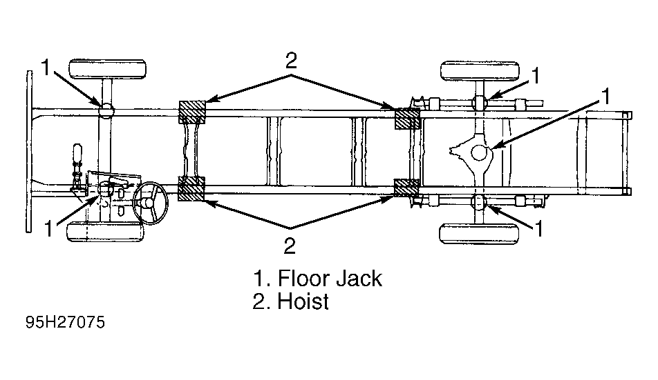 Put floor jack or vehicle hoist under vehicle at proper lifting points. See Fig 1. If raising vehicle on a twin-post hoist, do not damage suspension components, rear axle cover, or steering linkage.