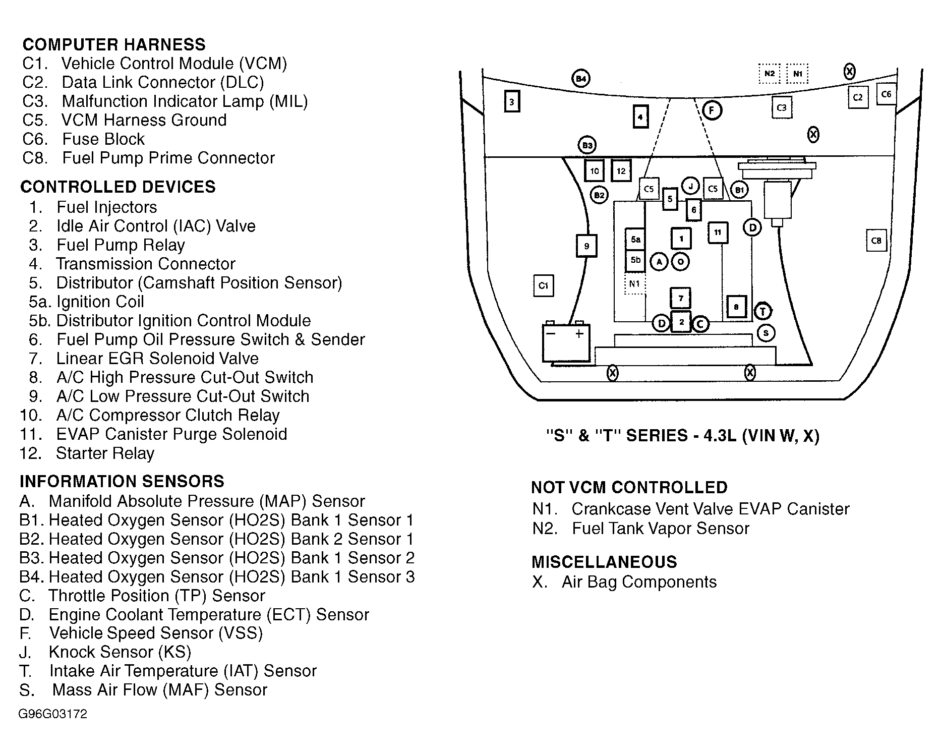 | Vehicle Control Module (VCM) (4.3L VIN W, X) | On right front of engine compartment. See Figure. |